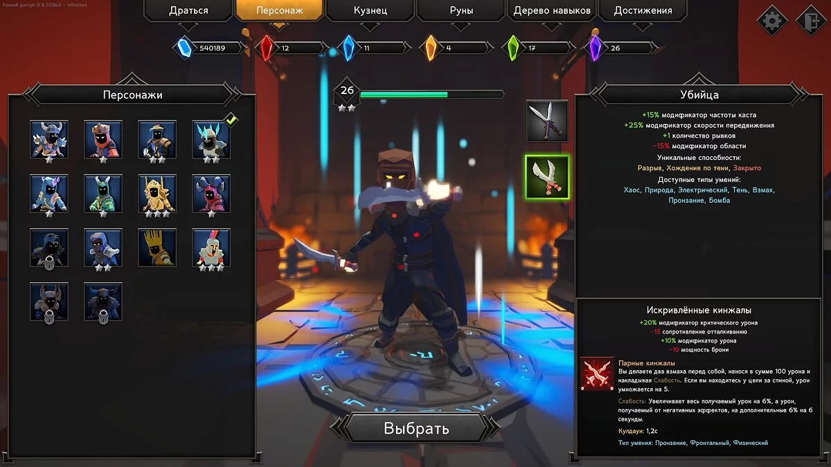 Персонаж, созданный без рывков. Вы больше не сможете увернуться и получить неуязвимость, но взамен получите огромную базовую скорость и расширенную атаку по площади. Для подстраховки нужно будет взять навык «Крепость», чтобы случайно не умереть от луж с ядом. Избегайте любого замедления, потому что это почти всегда конец игры. Из активных навыков хорошо себя раскрывают «Уничтожение», «Буря клинков» и «Теневой шар». По пассивным навыкам сосредоточьтесь на дебафе «Рок», который убивает врага при достижении определённой отметки здоровья. Остальные навыки нужно брать на скорость перемещения, скорость атаки и увеличение области поражения. Идеальный персонаж для прохождения карты быстрее, чем за 8 минут.