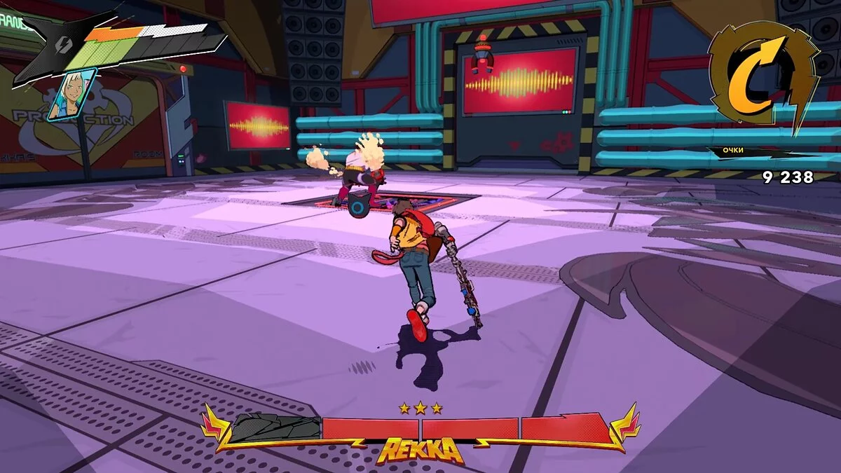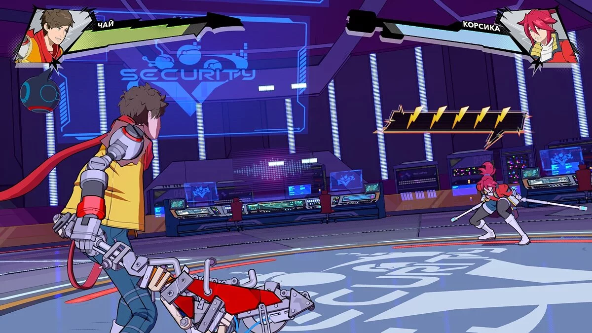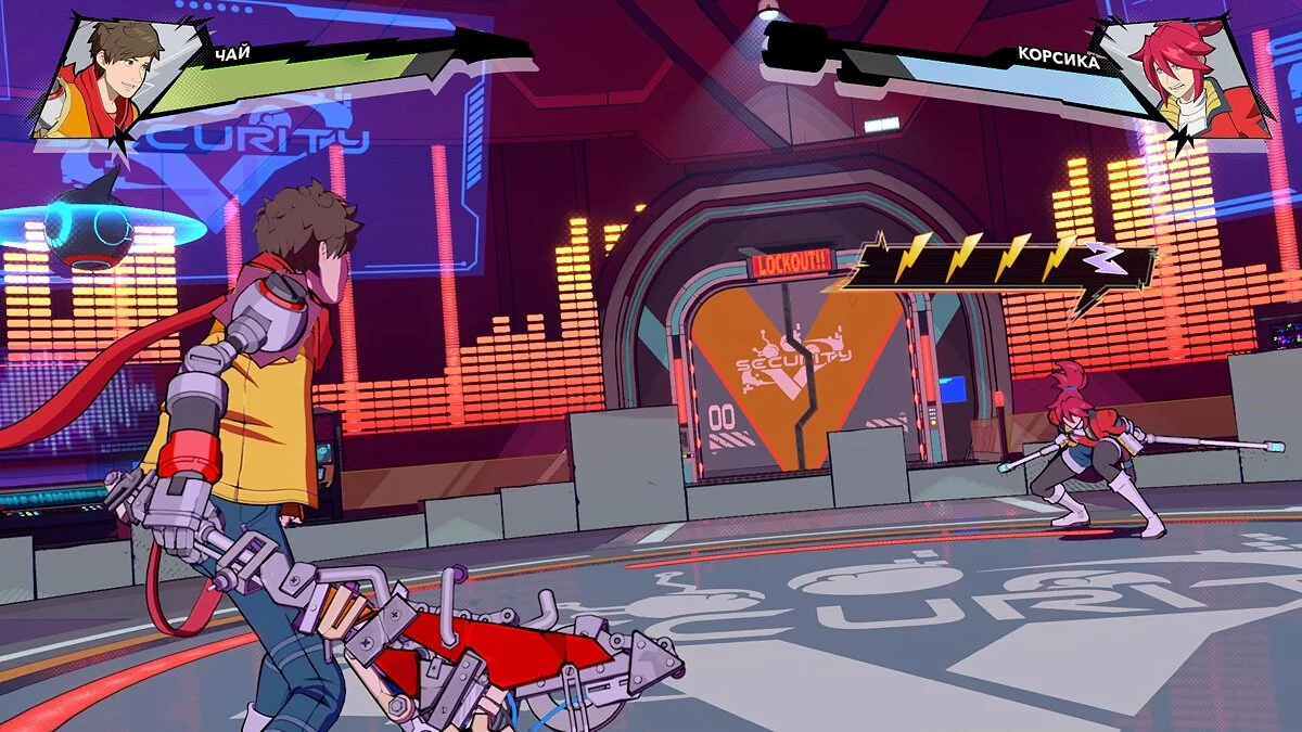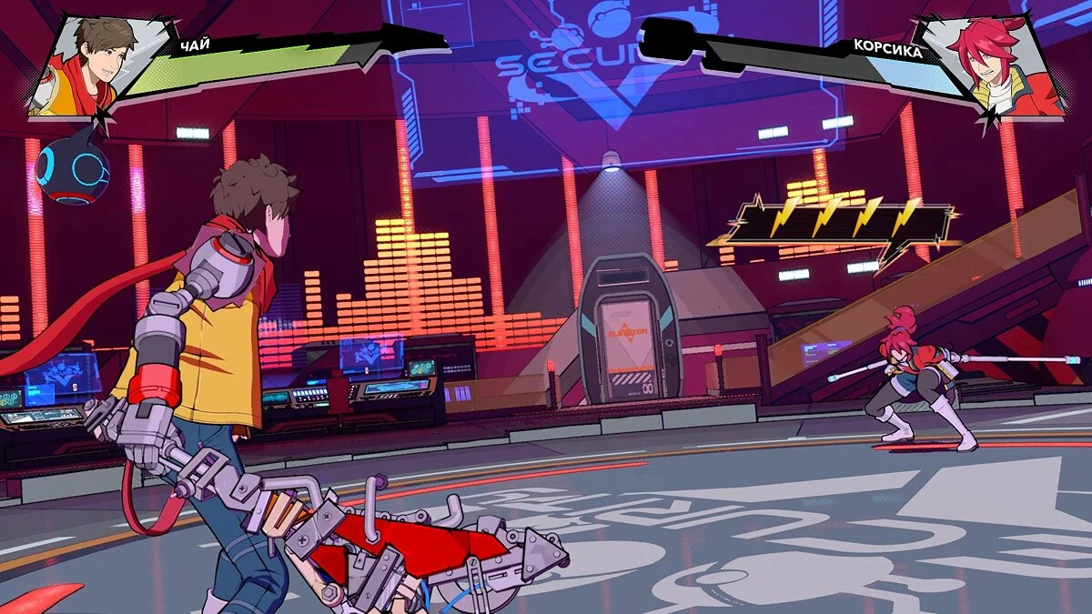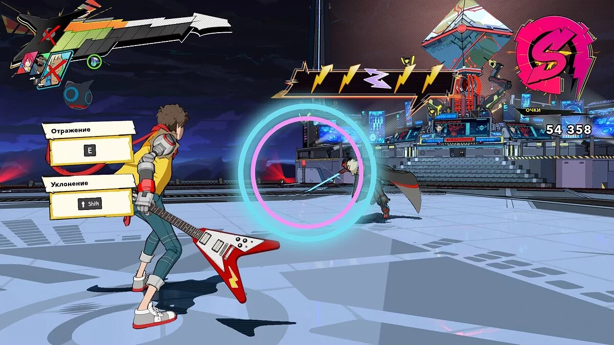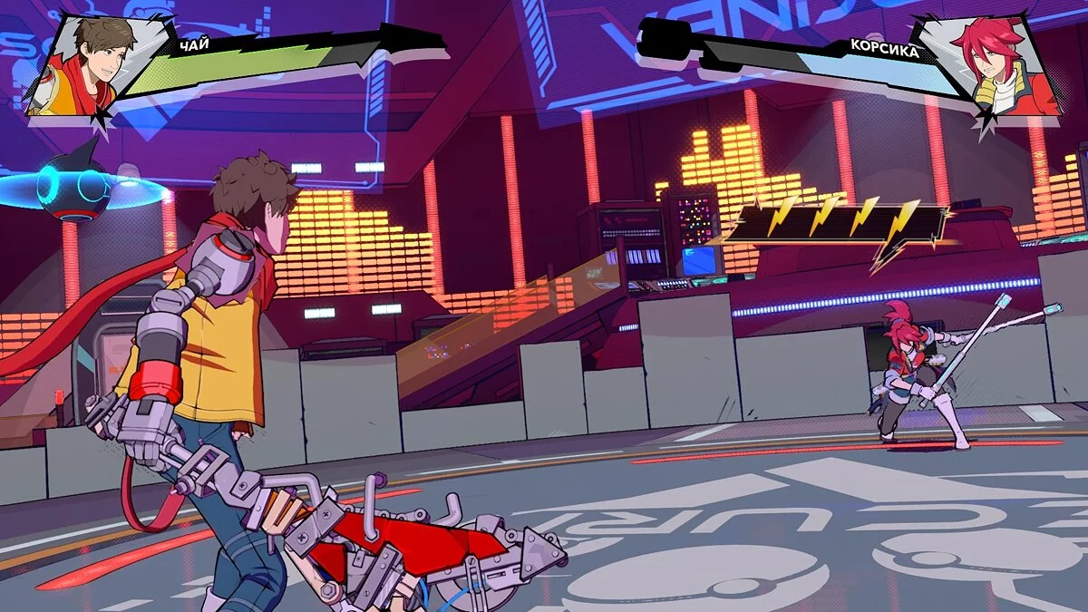 К этому моменту вы изучите механику отражения ударов. Именно её придётся использовать в сражении с боссом. Слушайте бит и повторяйте отражения в такой же последовательности. Если хотя бы один раз не попадёте в такт, то здоровье героя снизится, а Корсика снова повторит последнюю атаку.