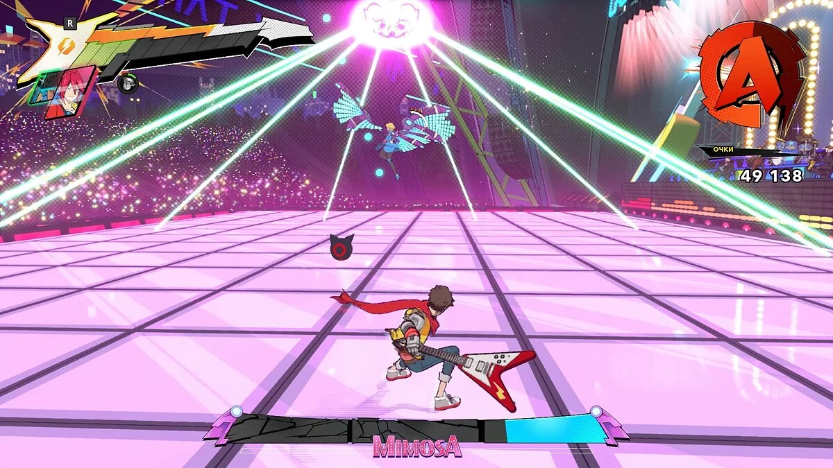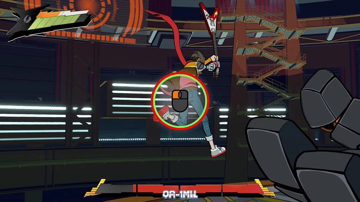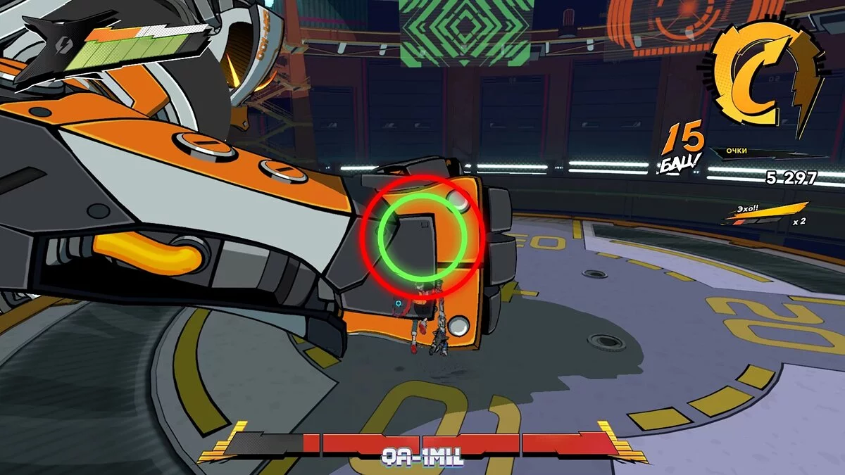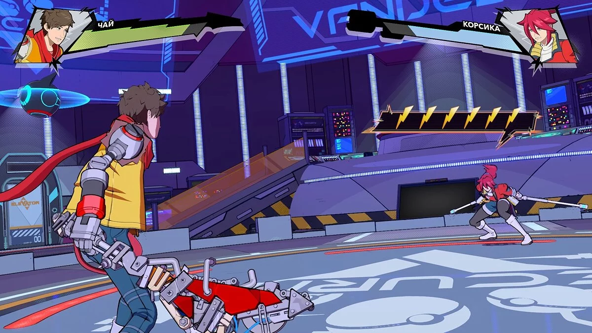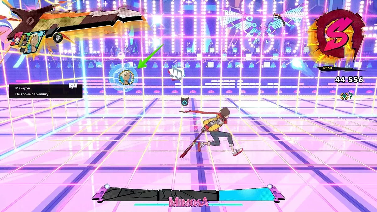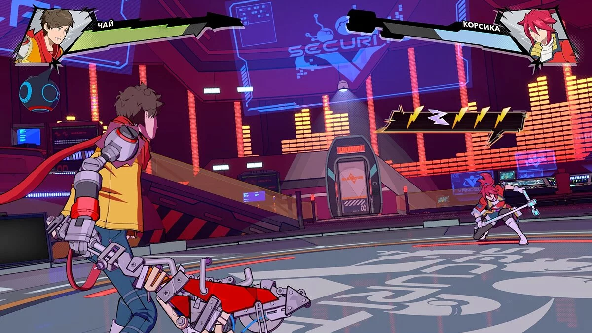 К этому моменту вы изучите механику отражения ударов. Именно её придётся использовать в сражении с боссом. Слушайте бит и повторяйте отражения в такой же последовательности. Если хотя бы один раз не попадёте в такт, то здоровье героя снизится, а Корсика снова повторит последнюю атаку.