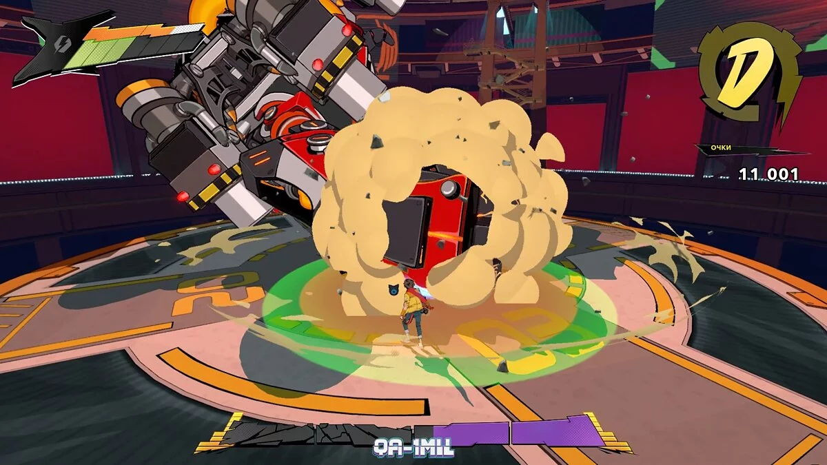 Робот пустит в ход ракетные установки. Пока что протагонист не умеет отражать удары, поэтому придётся уворачиваться. Используйте двойной прыжок и рывок, чтобы вовремя отскочить от предположительного места взрыва ракет.