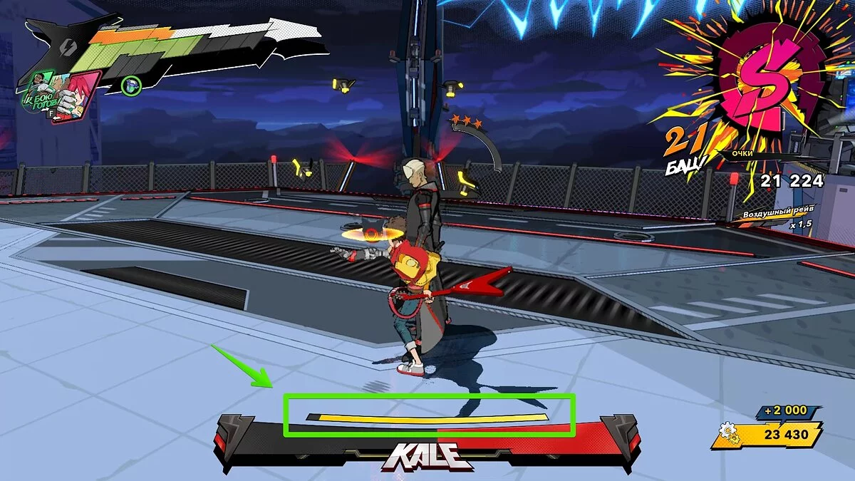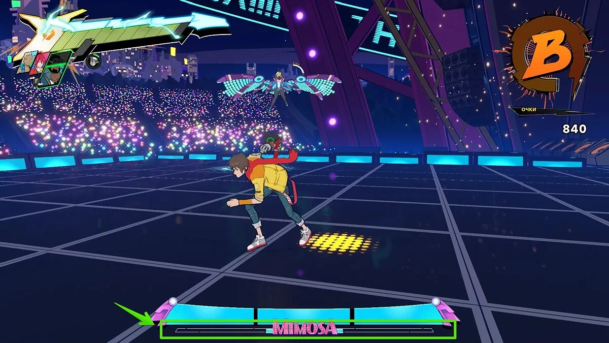 Здесь всё просто. В верхней части экрана отображается шкала силы главного героя и босса. Снизу будет активная шкала битов — просто вовремя нажимайте на появляющиеся кнопки.