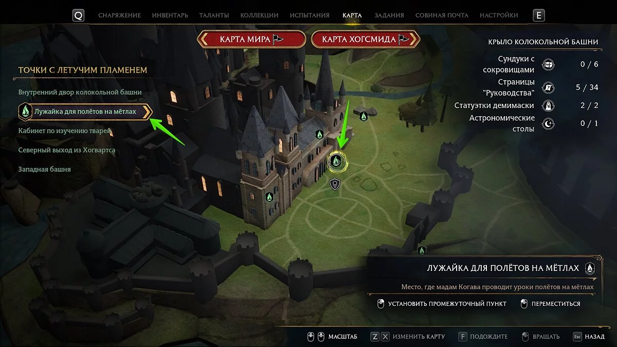 Когда будете готовы, используйте быстрое перемещение в Крыло колокольной башни, Лужайка для полётов на мётлах.