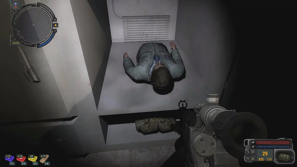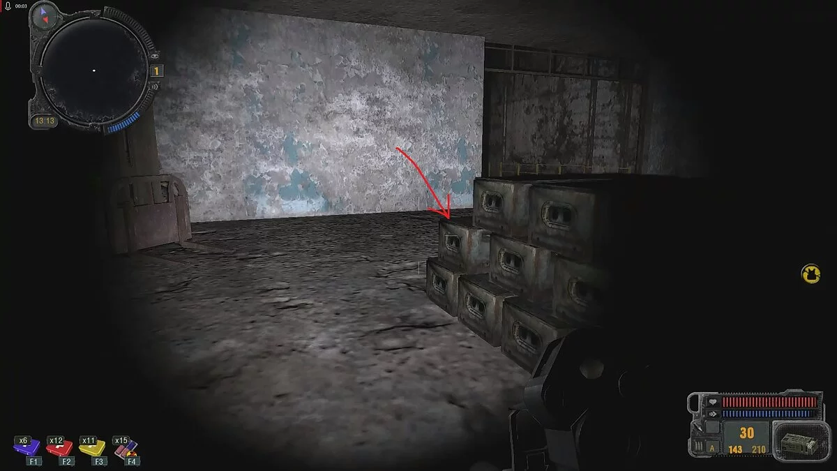Используйте укрытия и уничтожайте турели обычным огнестрельным оружием как можно быстрее. Поднявшись по лестнице и уничтожив первую турель с новой группой монолитовцев, откройте замок с помощью ключа. Уничтожьте всех противников в комнате и внимательно обыщите её на наличие аптечек, патронов и других полезных предметов. Тут же в комнате есть морозильные камеры, в двух из которых лежат трупы. Под ними можно открыть маленькие дверцы и обнаружить два детектора аномалий «Отклик» и «Сварог».