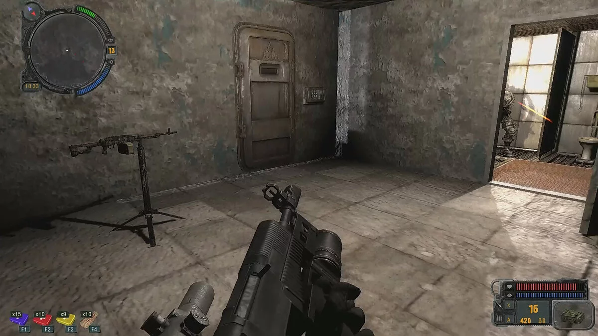 Бегите в самое начало, к развилке, где вы поднимались наверх, но теперь спускайтесь вниз и убейте врагов по пути. При спуске справа от вас будет ещё одна дверь — взломайте её ключом, соберите оружие, патроны, еду и медикаменты. Дверь в конце этого коридора ведет в молитвенную комнату, где вы уничтожили группу монолитовцев. Взломайте дверь справа при помощи электронного ключа. Уничтожьте всех противников и взорвите турель. Также тут можно собрать несколько артефактов.