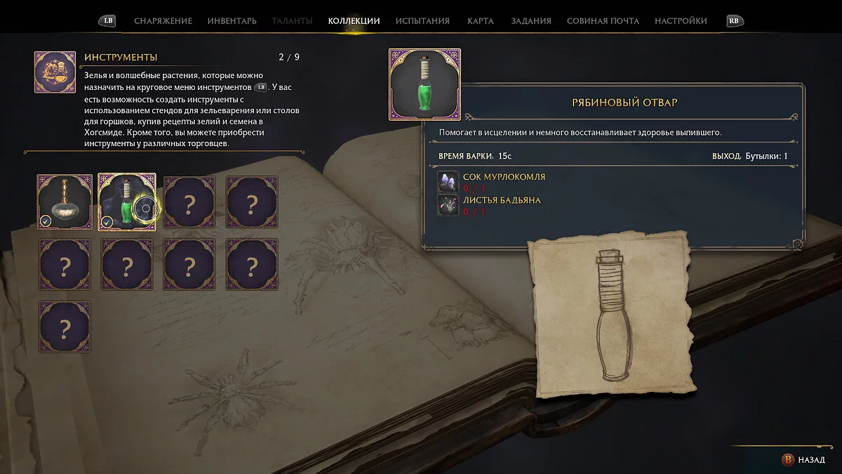 Сок Мурлокомля: Отправляйтесь в маленькое подземелье Лощина Мурлокомля, рядом с верхним Хогсмидом. Пройдитесь по подземелью и соберите 11 ингредиентов, после чего перейдите на карту мира и подождите три дня. Для этого нажмите R3/X или ПКМ. После этого растения вновь появятся и вы сможете их собрать.