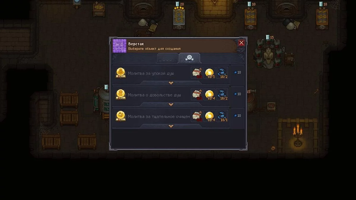 - Молитва за упокой душ. Чем больше очищенных душ, тем больше веры. Эффекты: деньги с проповеди +25%, вера с проповеди +50%, 1 серебряная монета за веру (х1);