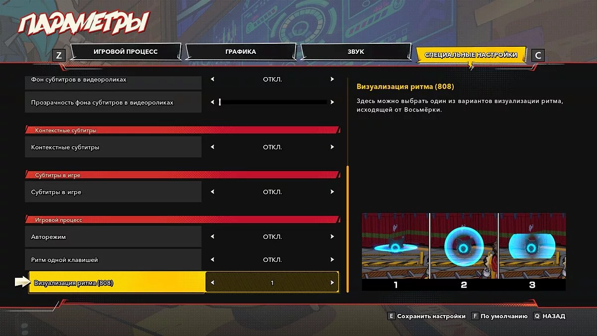 - Рядом с героем всегда летает робо-кошка Восьмерка, которая испускает импульсы в такт мелодии. Если вам сложно следить за её метрономом, тогда откройте «Настройки» и перейдите на вкладку «Специальные настройки». В опции «Визуализация ритма (808)» выберите подходящую визуализацию импульсов компаньона.