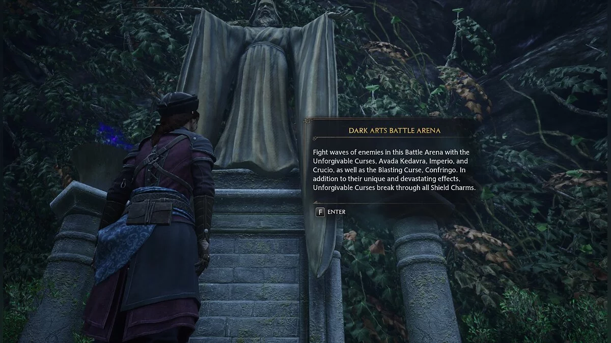 Боевая арена темных искусств доступна только для владельцев предзаказа, включающего DLC «Dark Arts Pack». Она не нужна для получения достижения. Здесь вы можете использовать все три непростительных заклятия: Авада Кедавра, Империо и Круцио, а также взрывающее заклятие Конфринго. В дополнение к своим уникальным и разрушительным эффектам, непростительные заклятия пробивают все Защитные чары. Вход находится в Запретном лесу (Forbidden Forest).