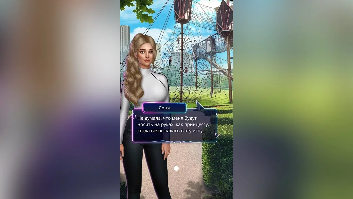 Прибыв на детскую площадку, ты увидела верёвочный парк — канаты, сплетённые в туннели, лестницы и горки. Над ним Дэниел заметит шары, к которым что-то привязано.