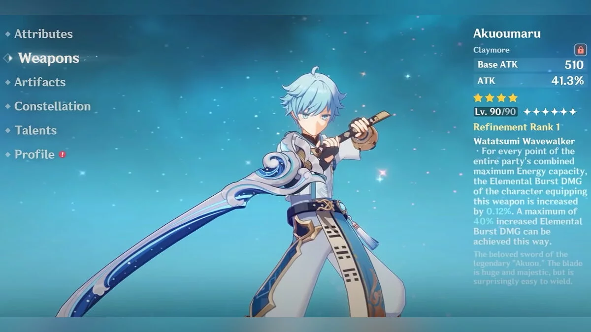 «Акуомару». Неплохой четырёхзвёздочный меч с бонусом к взрыву стихий. Его базовая атака составляет 42-510 единиц, и урон дополнительно увеличивается 9-41,3%. Урон взрыва стихий увеличивается на 0,12-0,24% за каждую единицу энергии всех бойцов в отряде, но не более 40-80%. «Акуомару» вы получите во время молитвы «Воплощение божества».
