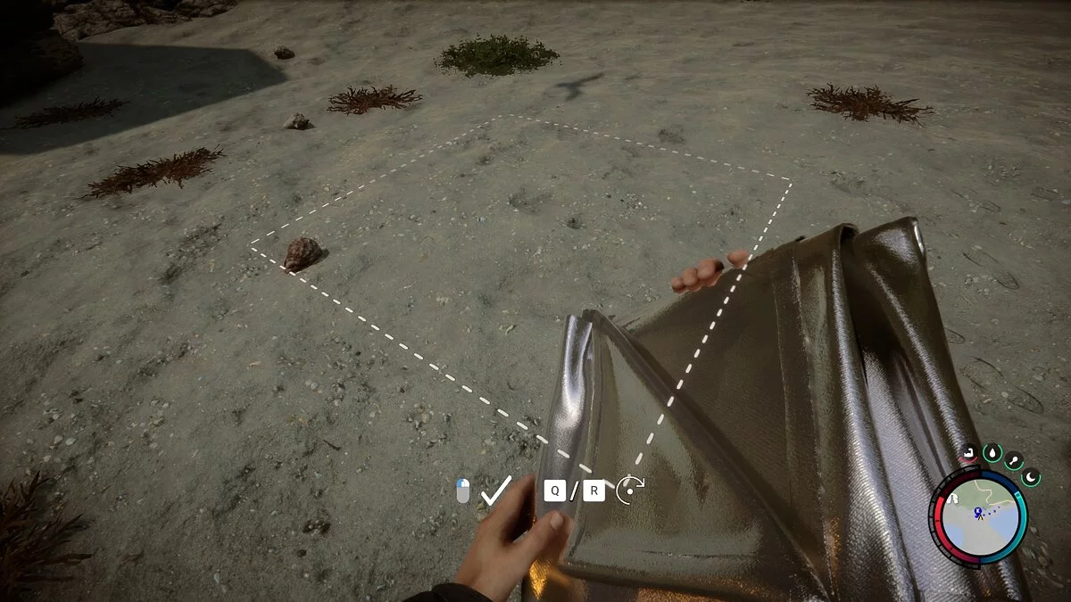Подойдите к краям тяжелой ткани и нажмите на ЛКМ, чтобы установить две палки. Так вы получите своё первое примитивное убежище. Теперь вы можете отдохнуть и сохранить прогресс в любое время. Для этого подойдите к палатке и зажмите клавишу «E».
