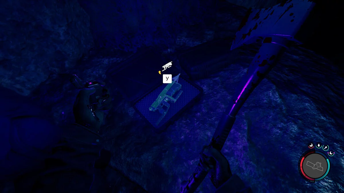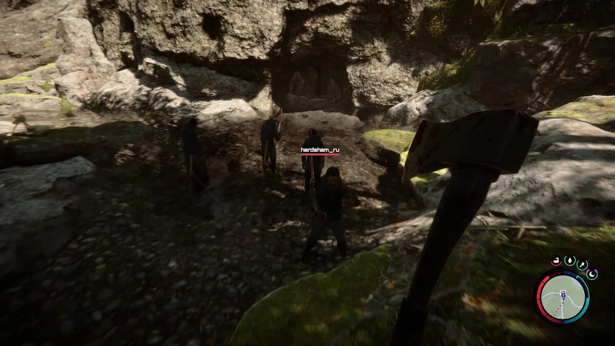 Чтобы найти лопату, вам нужно войти в систему пещер на западе от заснеженной горы в центре карты. Подземелье можно найти, следуя вдоль берега ручья. Снаружи будет три мёртвых тела на пиках. Если вы идёте сюда сразу после пещеры с аквалангом, то просто следуйте вдоль реки на юг. Либо можете ориентироваться по скриншоту выше. Нужная пещера находится северо-восточнее текущего положения персонажа.