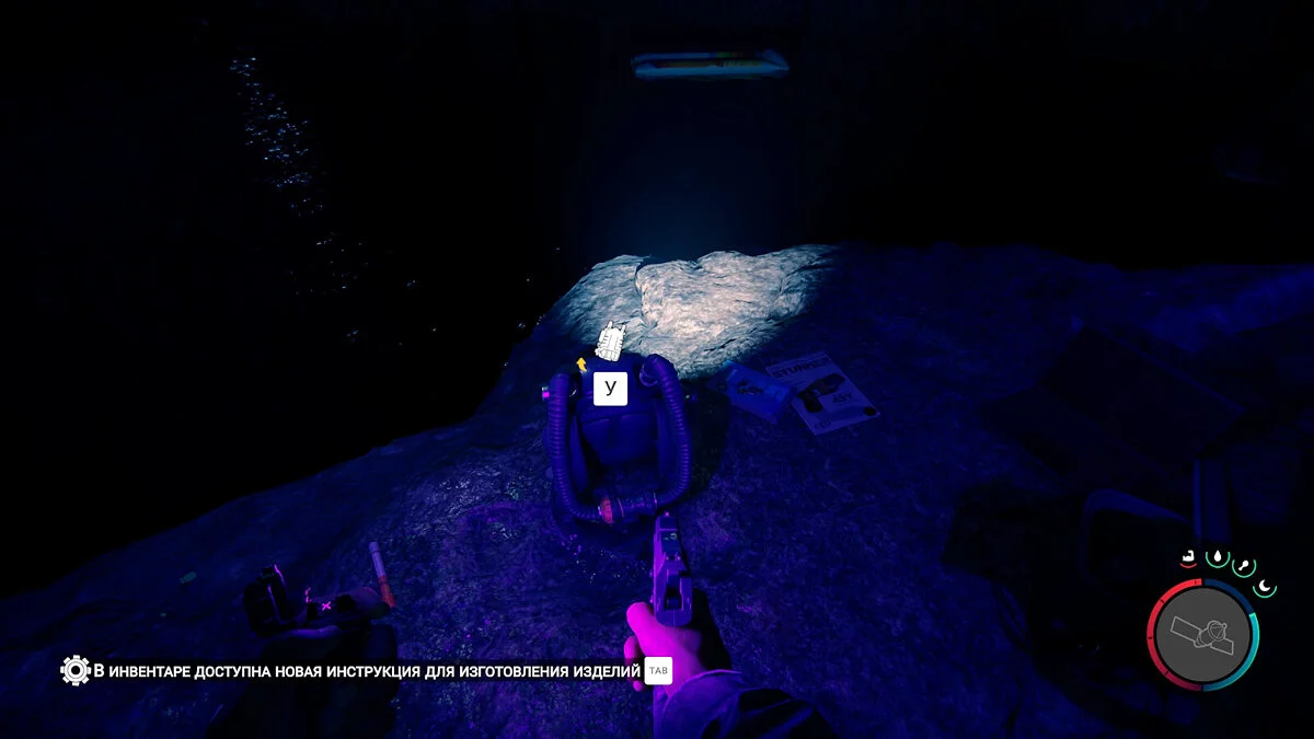 Осветите себе путь и идите вперёд, пока не достигнете обрыва. Не прыгайте вниз! Вместо этого посмотрите наверх и отыщите трос. При помощи тросомёта переберитесь на другую сторону. Здесь вам нужно использовать акваланг, чтобы проплыть под землёй.