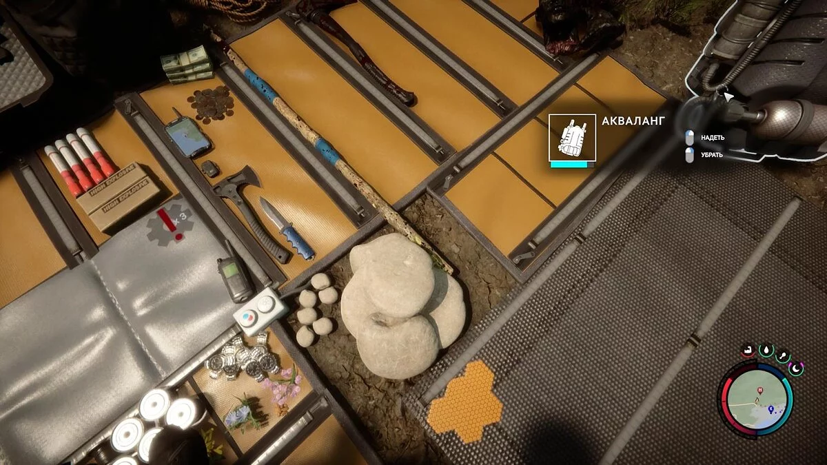 Если вы не хотите тратить кислород в баллоне, можете открыть инвентарь и снять акваланг. Для этого просто наведите на него курсор мыши на нажмите на указанную кнопку.