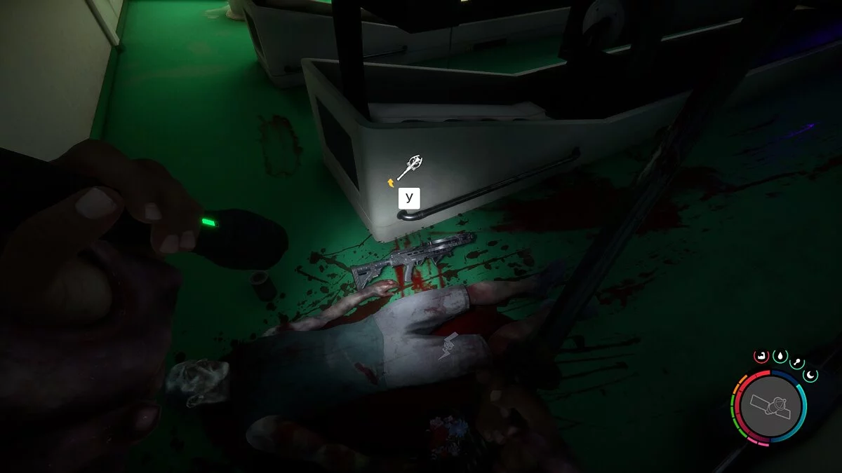 Спуститесь вниз и бегите по коридору вперёд. Зайдите в комнату справа и пройдите в ванную комнату. Справа от трупа лежит блочный лук. Здесь же вы можете обнаружить глушитель для пистолета и некоторые ценные припасы, например, смолу для 3D-принтера.