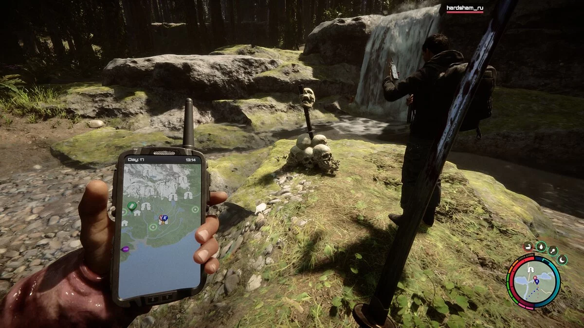 Для поиска дробовика также понадобится лопата. Если вы выполнили это условие, то отправляйтесь в указанное на скриншоте место и выкопайте могилу. Разбейте гроб любым оружием ближнего боя и осмотрите его. Внутри вы найдёте дробовик, а также GPS-маячок.