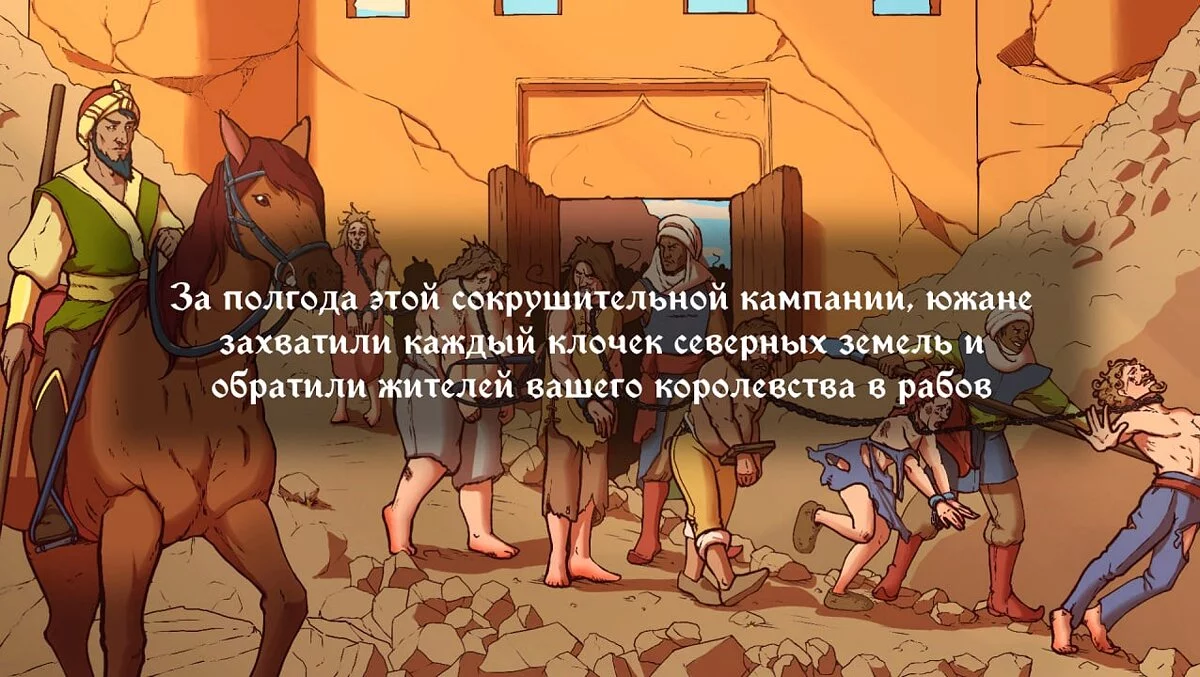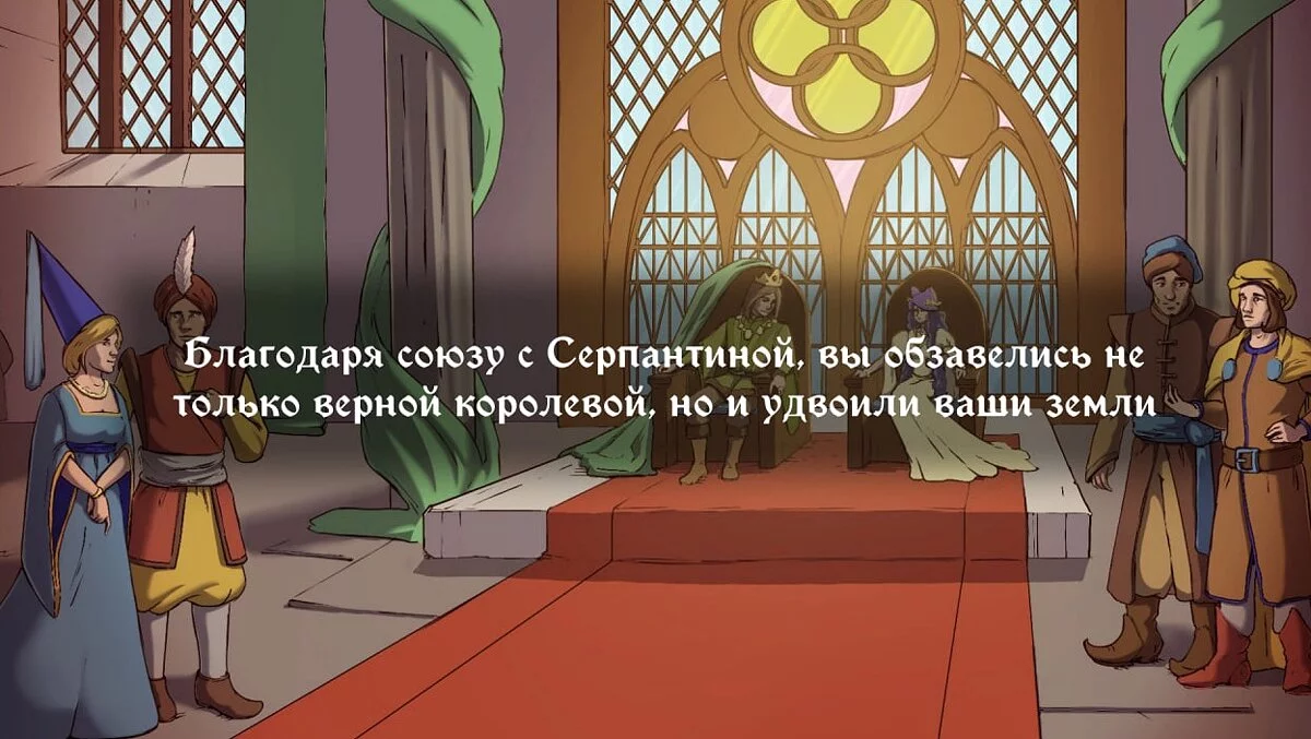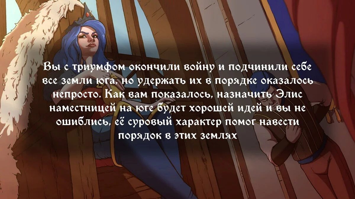 Ощутите вкус брака с холодной и жестокой женщиной. Во второй главе обязательно берём Элис в жёны, побеждаем в локации «Поход на южан». Набираем максимальное число отрядов, наступаем на «Столицу южан» и захватываем её силами набранных отрядов. После полного захвата юга, при выборе наместника передаем власть над югом Элис.