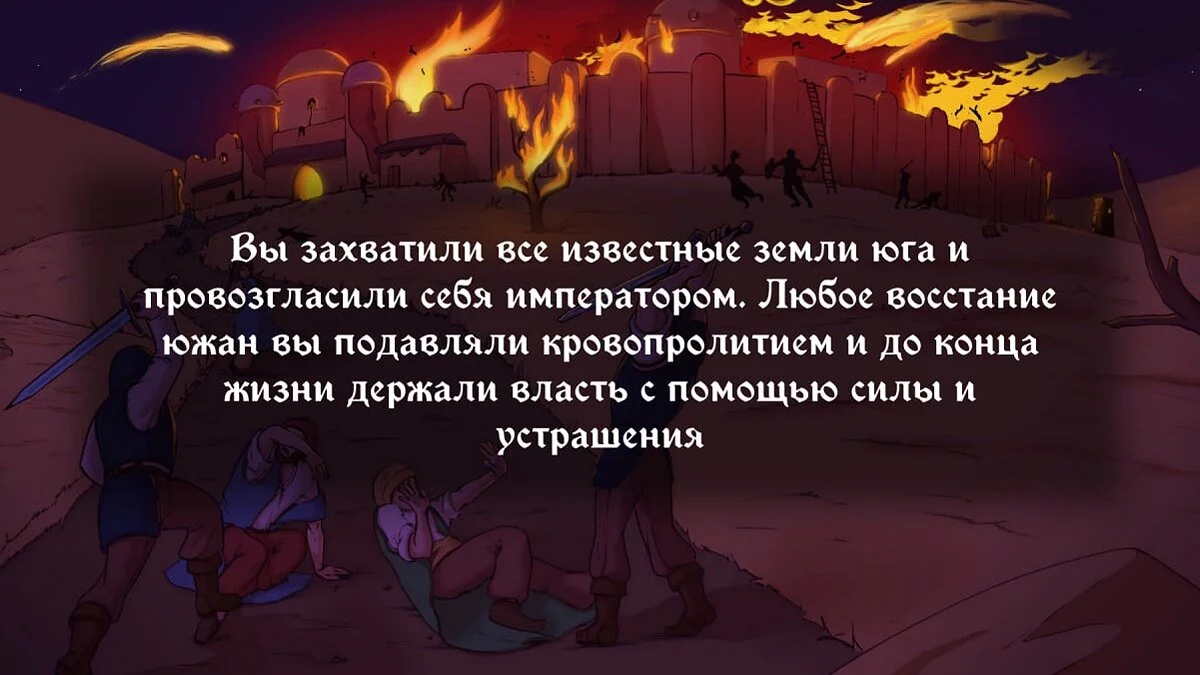 Наиболее прямолинейная концовка. Для её достижения побеждаем на локации «Поход на южан» и набираем максимальное число отрядов. Наступаем на «Столицу южан» и захватываем её силой. При выборе наместника выбираем любой предложенный вариант, кроме Элис, если она ваша жена.