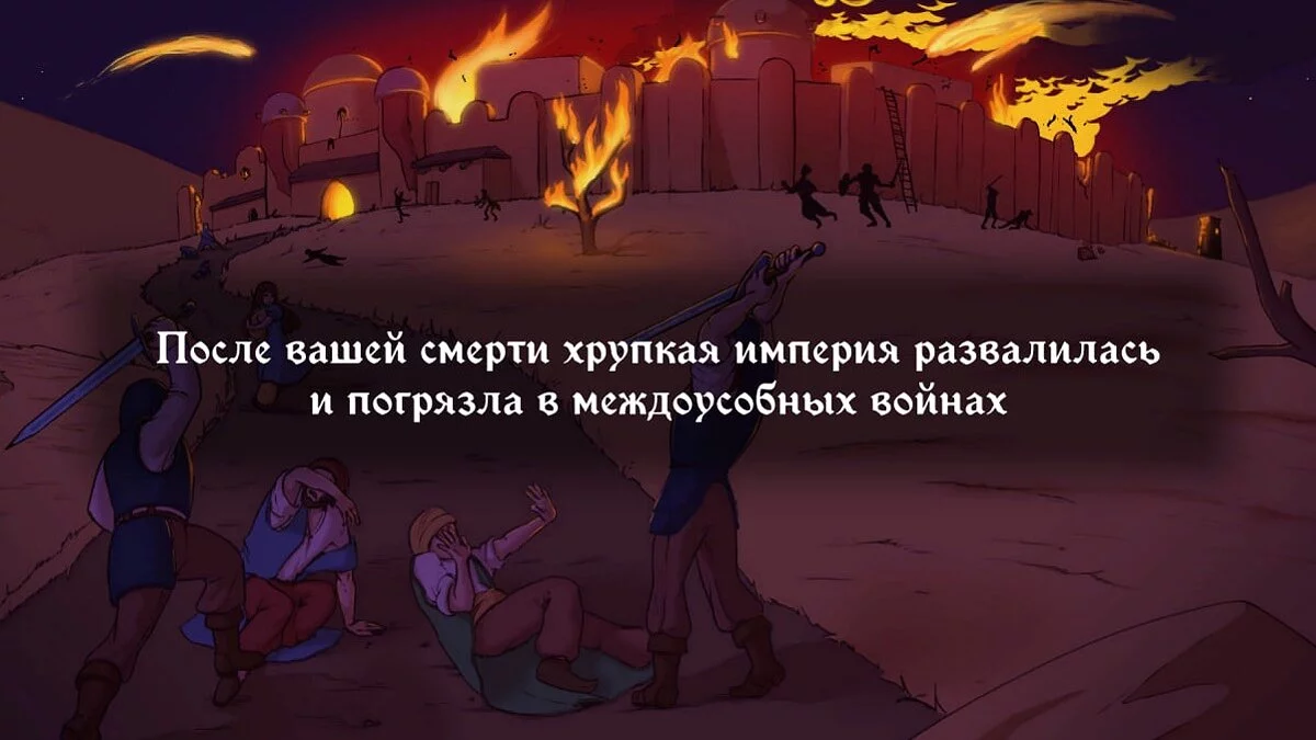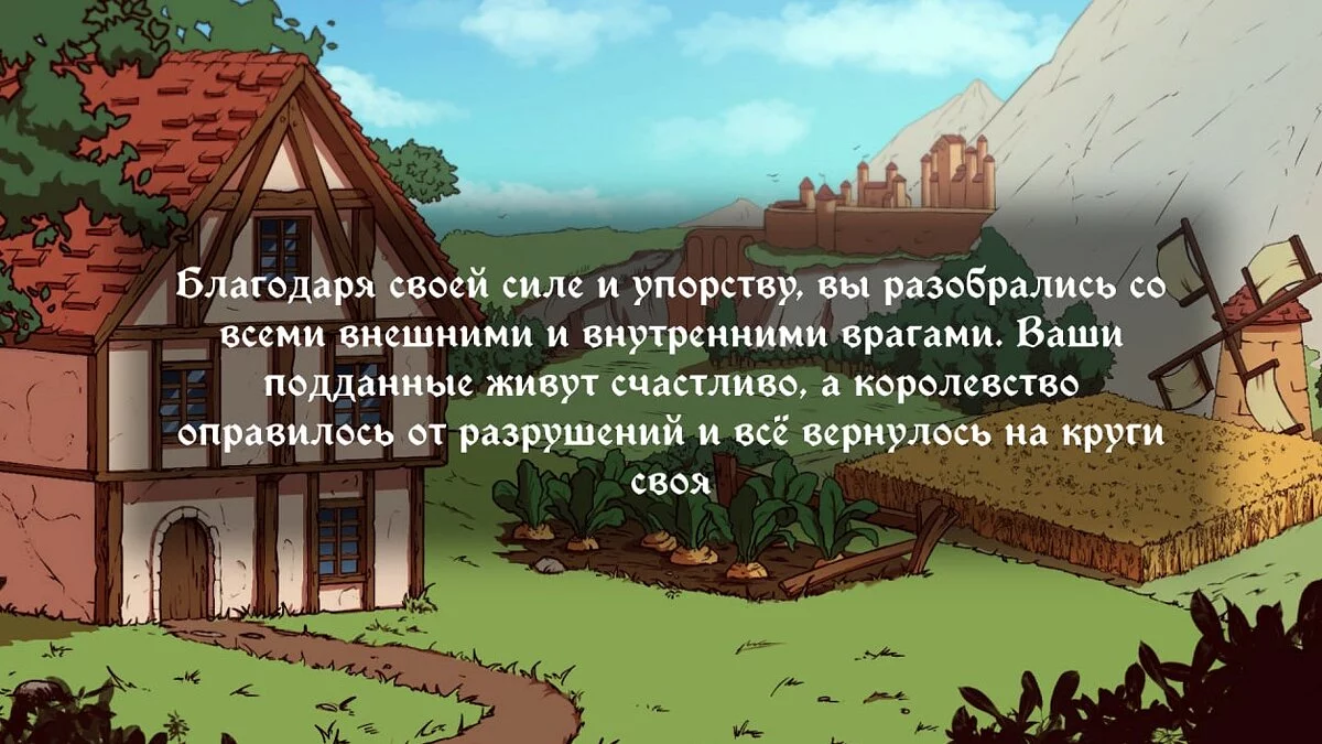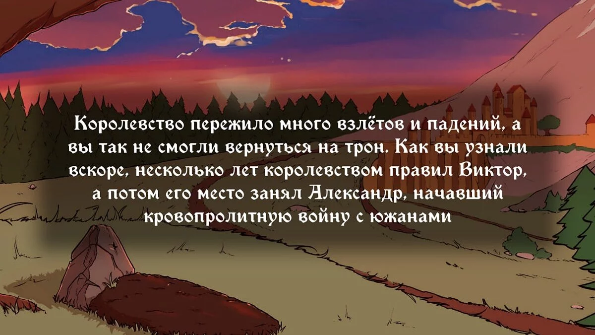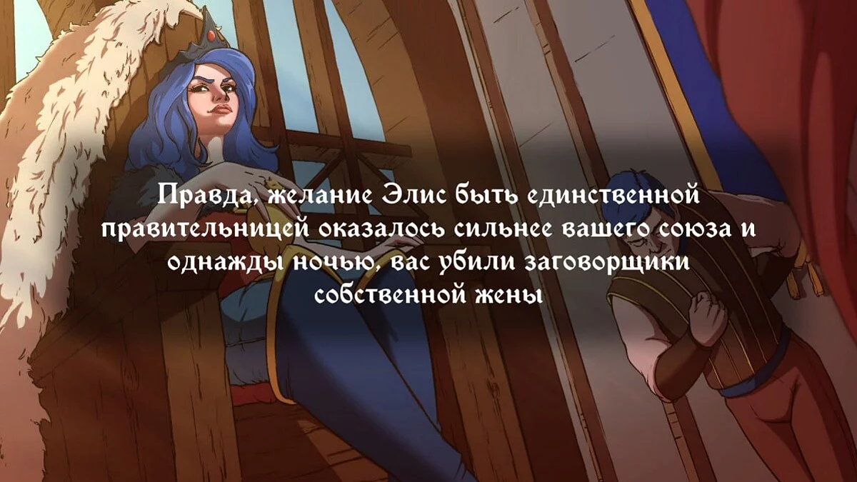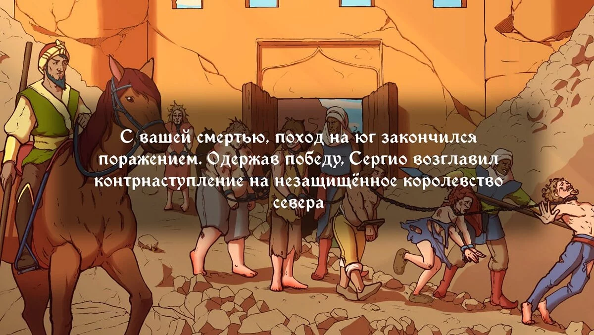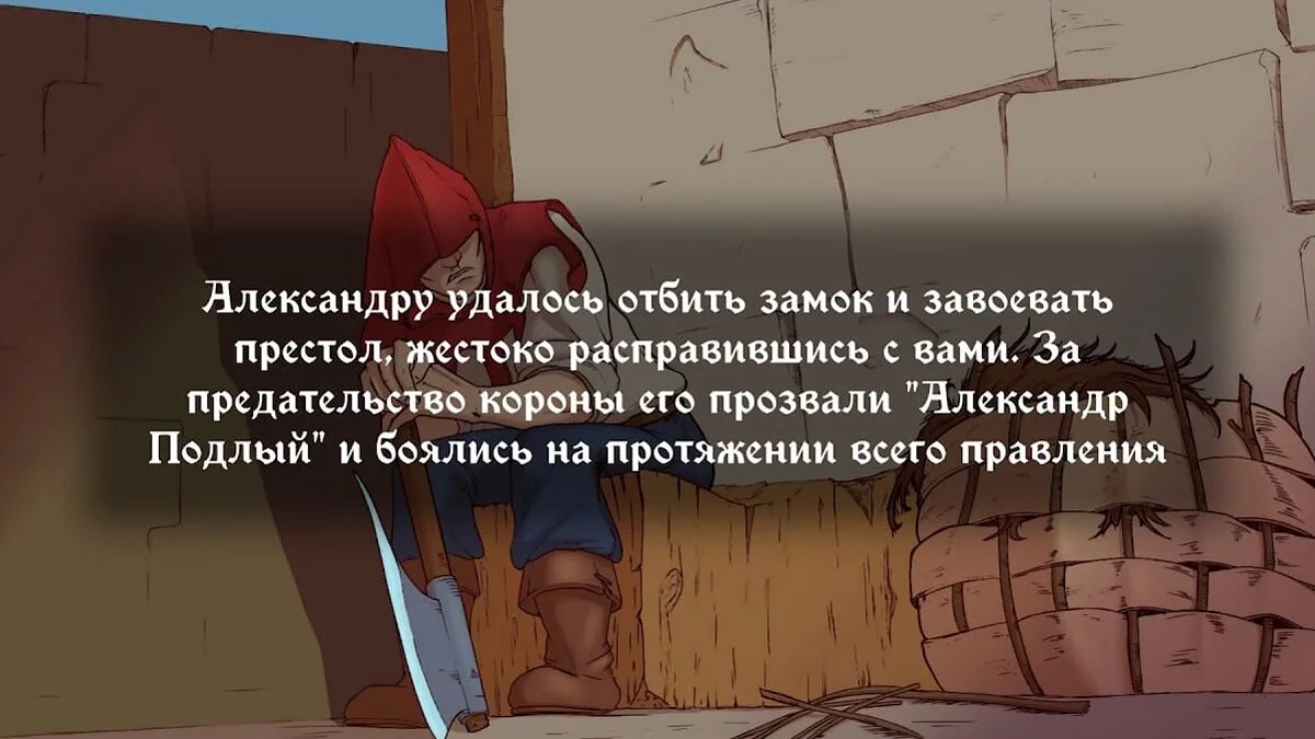 Обязательно оставьте на свободе виновника покушения на вашу жизнь. Выбор жены на концовку не влияет. Необходимо проиграть битву на локации «Поход на южан». Наберите наибольшее количество доступных отрядов отвоевывать собственный замок и убейте Сергио. В разговоре с Александром, признайте себя плохим королём и отрекитесь от престола.