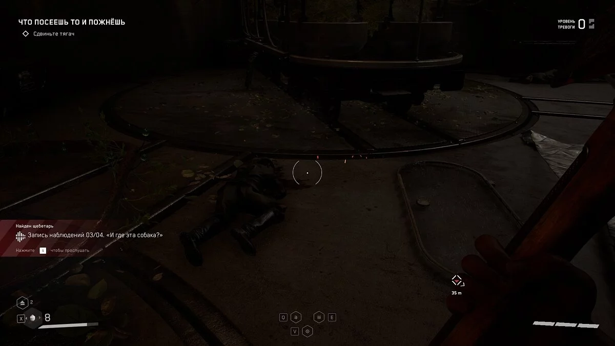 «Запись наблюдения 3». Решая головоломки с желтой цистерной, вы увидите вагон-парник, который вращается вокруг своей оси. Рядом лежит труп, а рядом лежит щебетарь.