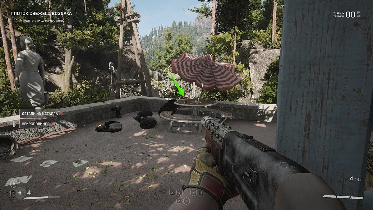 «Трансгуманизм — будущее!». В зоне с тестовым полигоном №9 вам нужно добраться до комплекса Коллектив. Рядом с этим зданием на столе с красным зонтиком лежит щебетарь. По левой стороне от столика будут лежать: мертвое тело и робот.