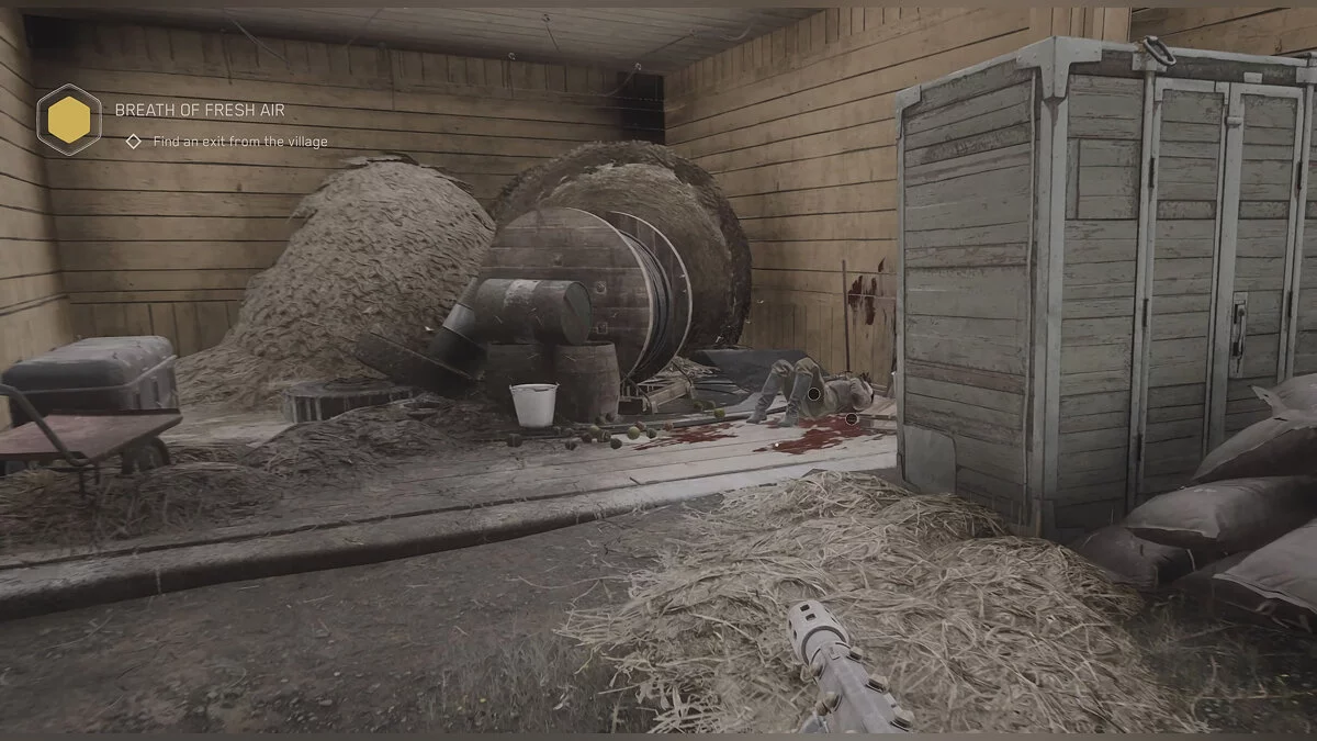 «Пиршество смерти». Выйдя из комплекса Вавилов, сворачивайте налево. Пройдите вперед и заберитесь на холм. Там находится жёлтый дом, а рядом сарай. Щебетарь в нём, лежит рядом с телом солдата.