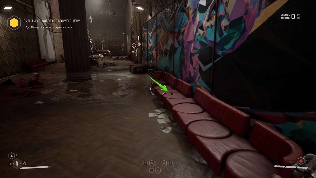 «Безответная любовь». Попав на локацию со сценой, поднимайтесь на второй этаж к балкону-ложе по правой стороне. Щебетарь лежит на столе, рядом с другим перевернутым столом.