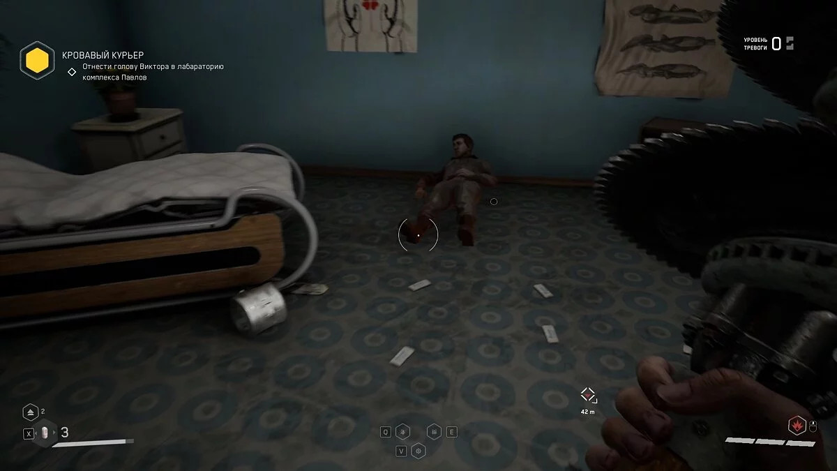 «Невинные всегда страдают». Возвращаемся к главному входу и поднимаемся по лестнице. На каталке лежит тело, а рядом щебетарь.