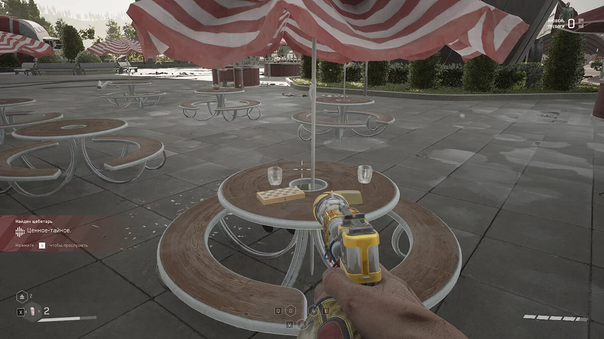 «Ценное-тайное». В области с первым полигоном, под монорельсовой дорогой, есть столики с зонтиками. На среднем столе по левой стороне лежит щебетарь.
