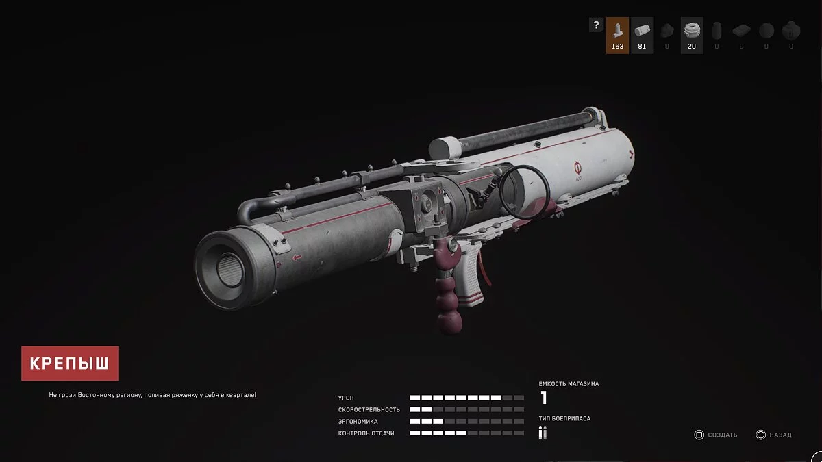 Крепыш. Гранатомёт обладает огромной убойной мощью, которая пригодится в сражениях с боссами. Боеприпасы для него встречаются редко, поэтому рекомендуем не тратить их на простых мобов. По крайне мере, пока вы не научитесь изготавливать их самостоятельно.