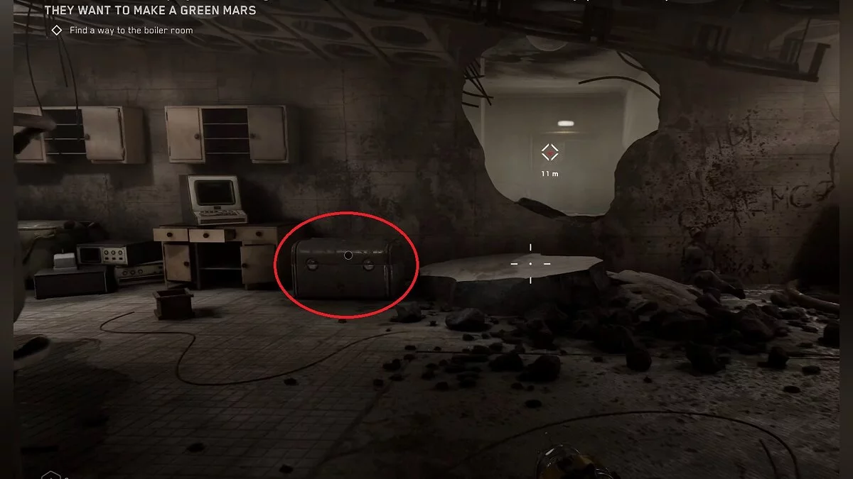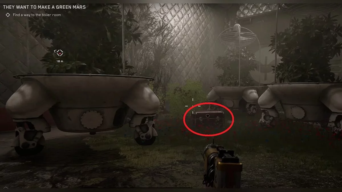 Во время прохождения задания «Они хотят озеленить Марс», во время поиска бойлерной, вы попадёте в помещение. которое заполнено растениями. По центру стоит красный ящик. Там лежит чертёж электрической кассеты.