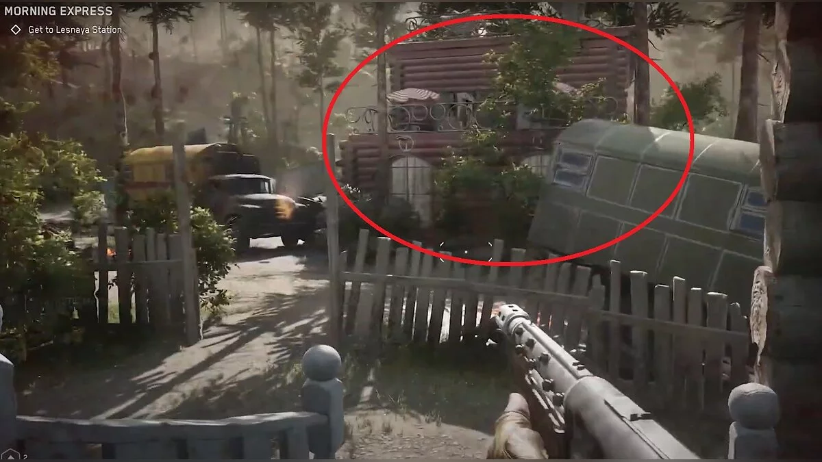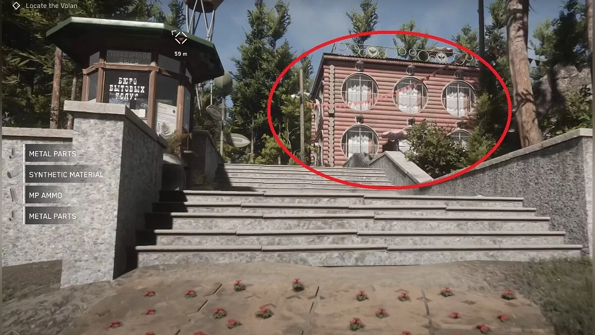 По дороге к станции «Лесная» с правой стороны вы увидите ещё один красный дом, в который можно зайти. Рядом с ним стоит грузовик с дымящимся двигателем, а на крыше здания есть огромная спутиниковая тарелка. По винтовой лестнице поднимаетесь на самый верхний этаж. Там лежит чертёж дубинки с циркулярной пилой «Снежок».