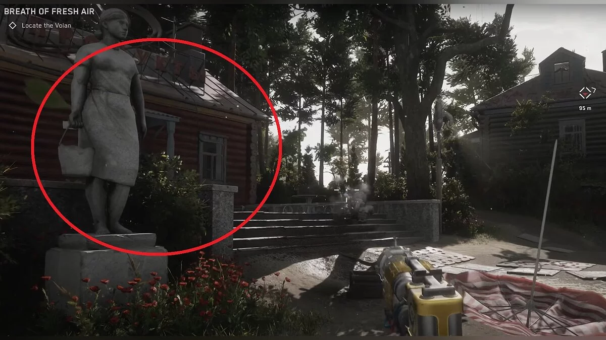 Во время изучения деревни вы увидите большой красный дом с круглыми окнами. Он находится недалеко от цели вашего задания, поэтому мимо вы не пройдёте. Поднимитесь по винтовой лестнице на второй этаж и выйдите на балкон. Там лежит чертёж рукоятки для Снежка.