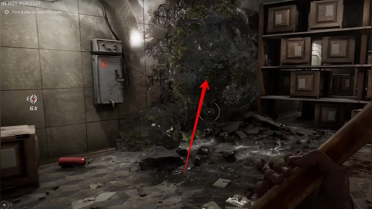 Недалеко от предыдущего ящика есть лестница, которая ведёт в Техноцех. Поднимитесь по ней и поверните направо. Прежде чем идти через дыру в стене обратите внимание на ящик слева от неё. Там находится инструкция по сборке зажигательных кассет.
