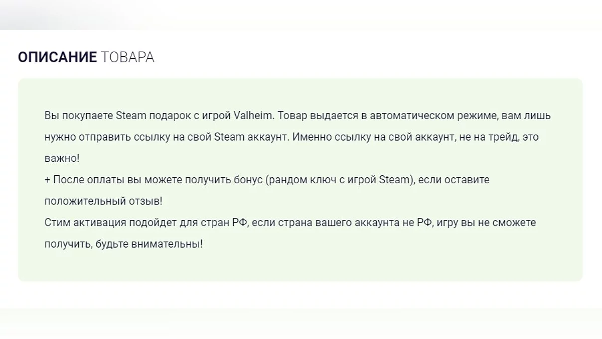 Описание товара всегда находится в нижней части страницы. Здесь вы сможете прочесть требования к вашему Steam аккаунту. В основном, если вы приобретаете игру для региона «Россия», то понадобится, чтобы аккаунт был привязан именно к этой стране.
