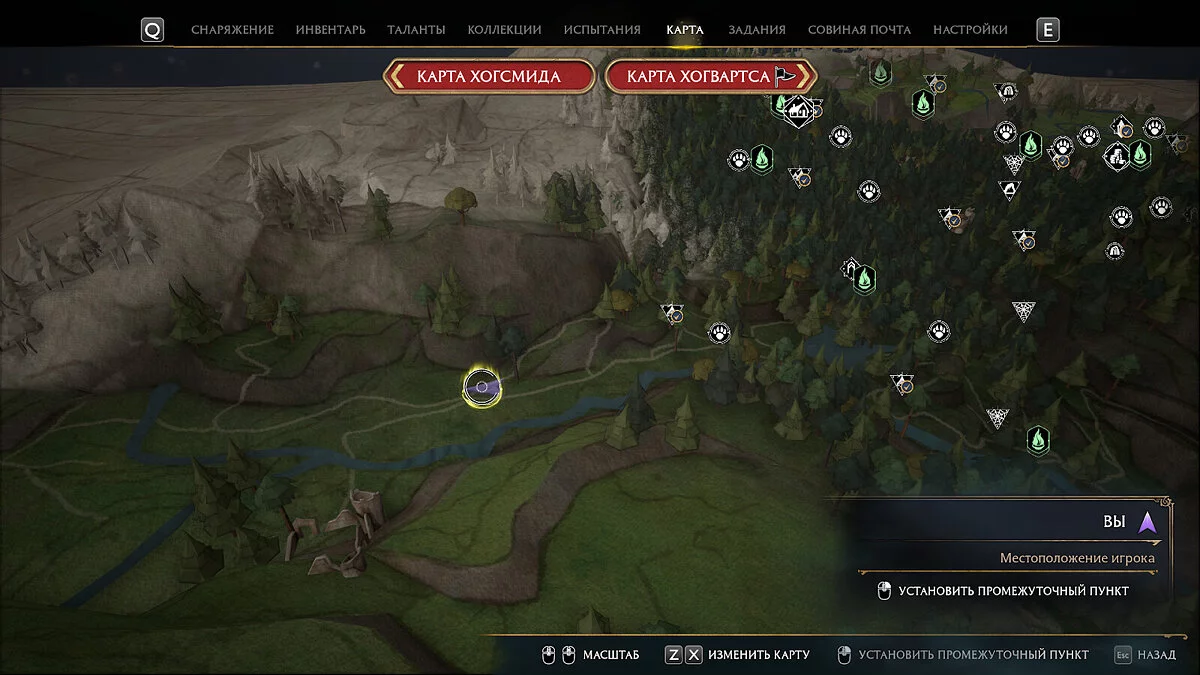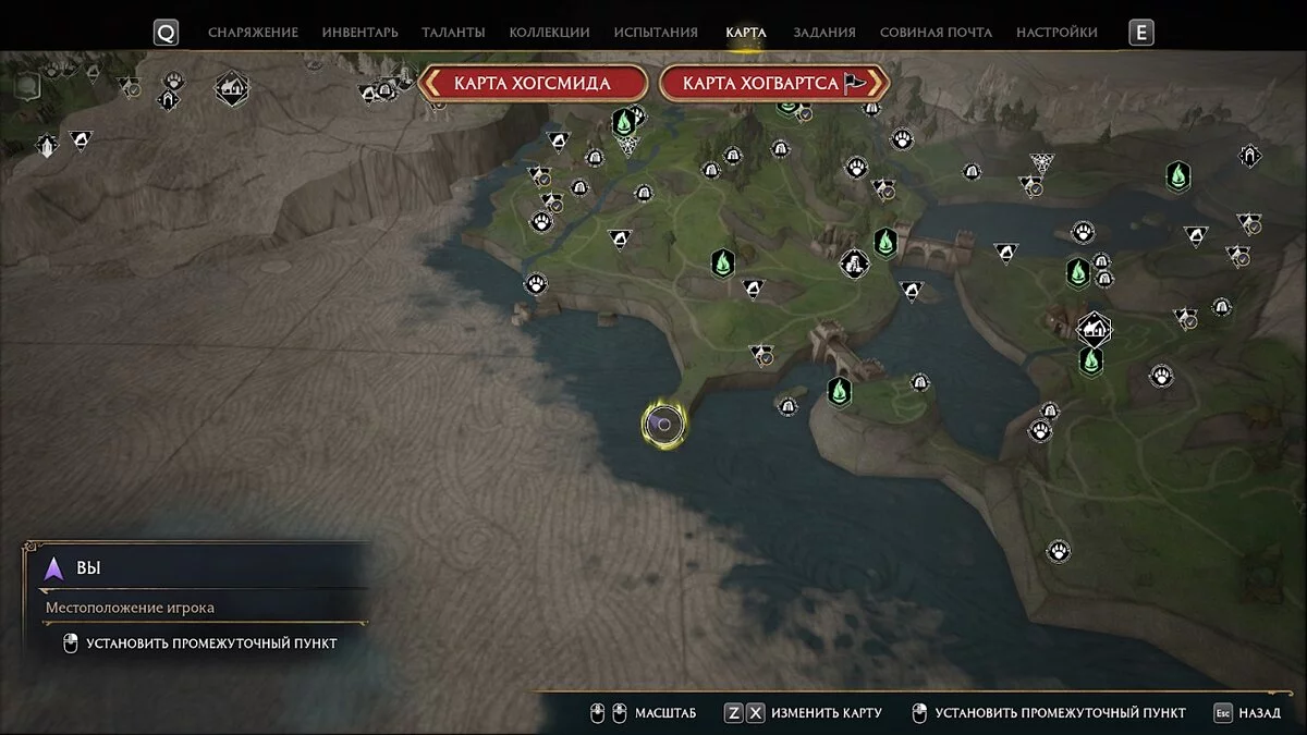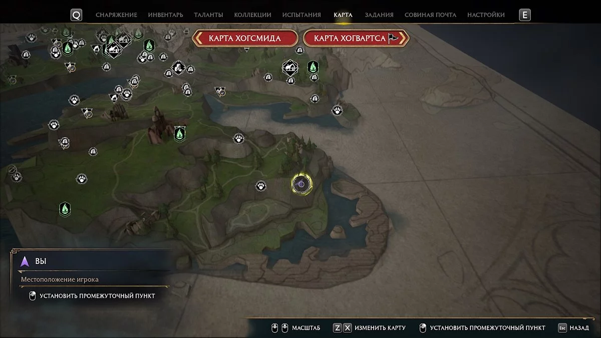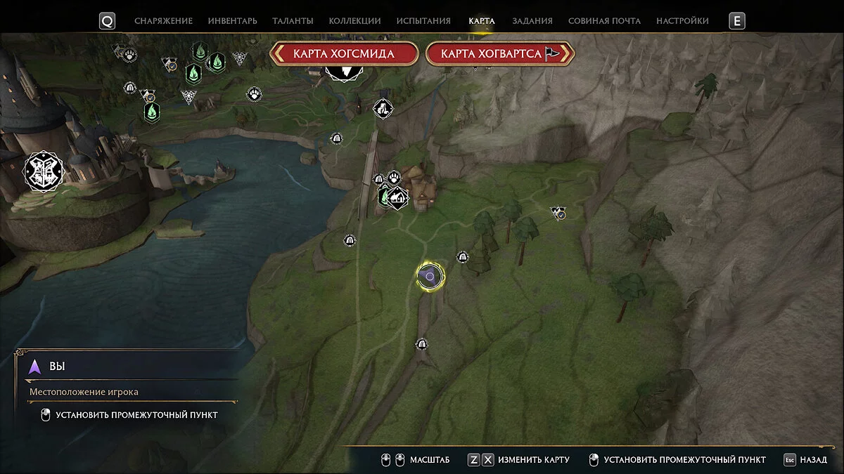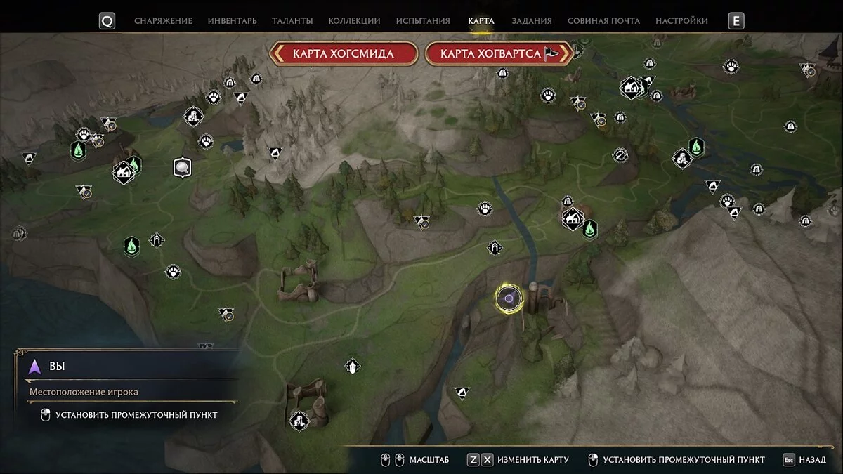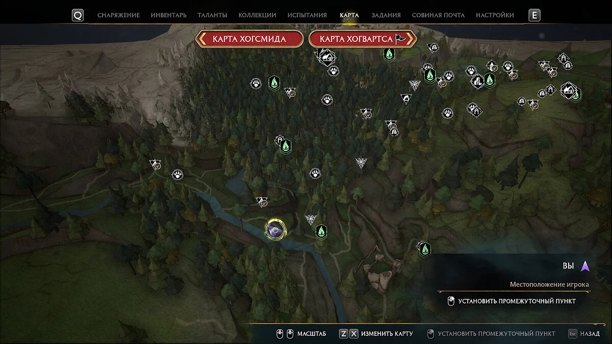 Телепортируйтесь в Хогсмид и летите на восток к горам. Рядом с испытанием Мерлина будет платформа.