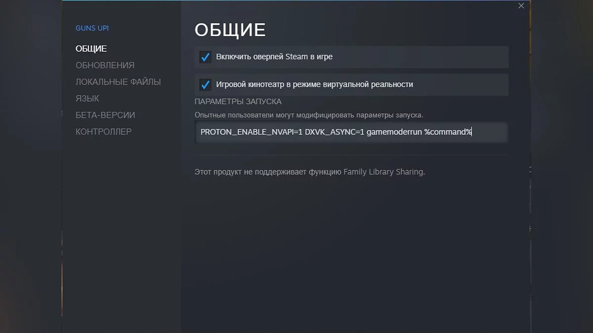- Впишите параметр «PROTON_ENABLE_NVAPI=1 DXVK_ASYNC=1 gamemoderrun %command%» без кавычек и закройте окно;