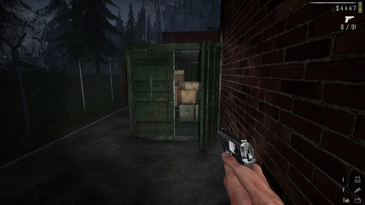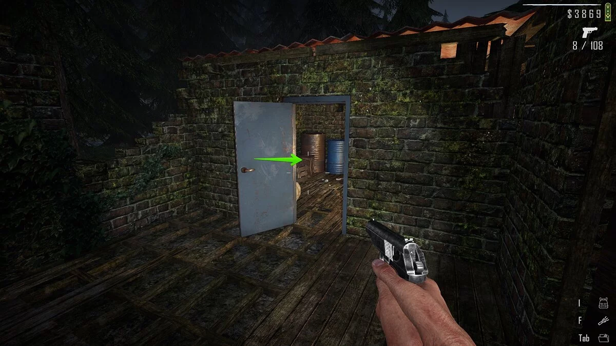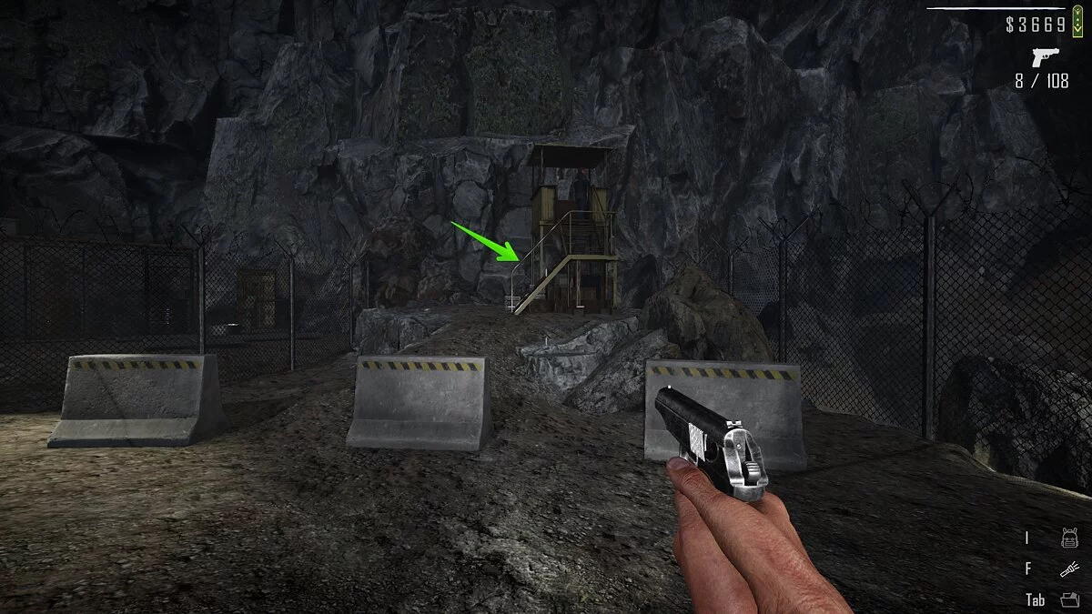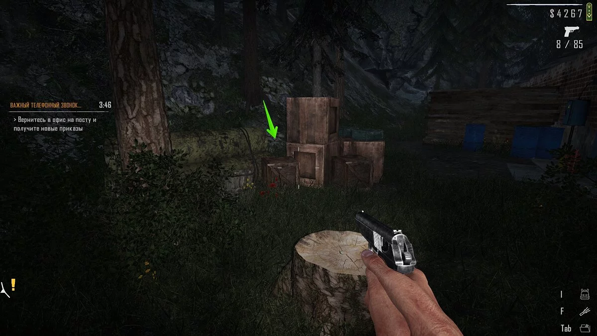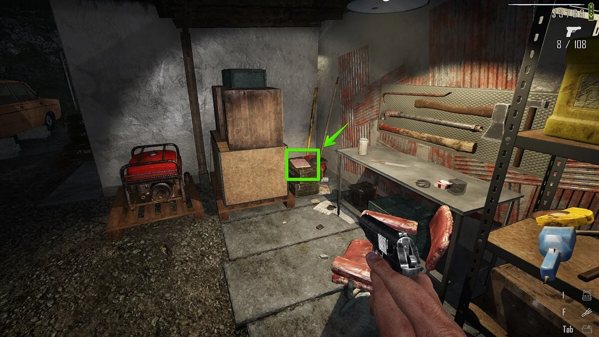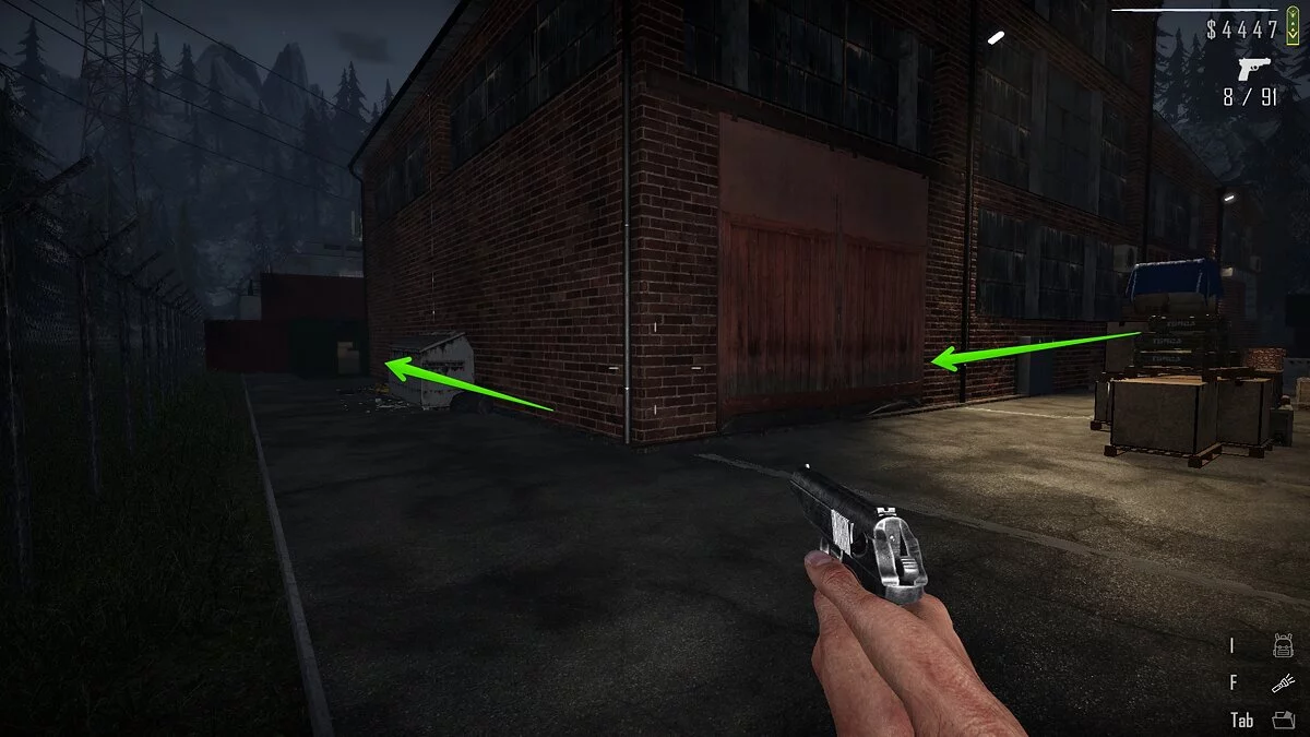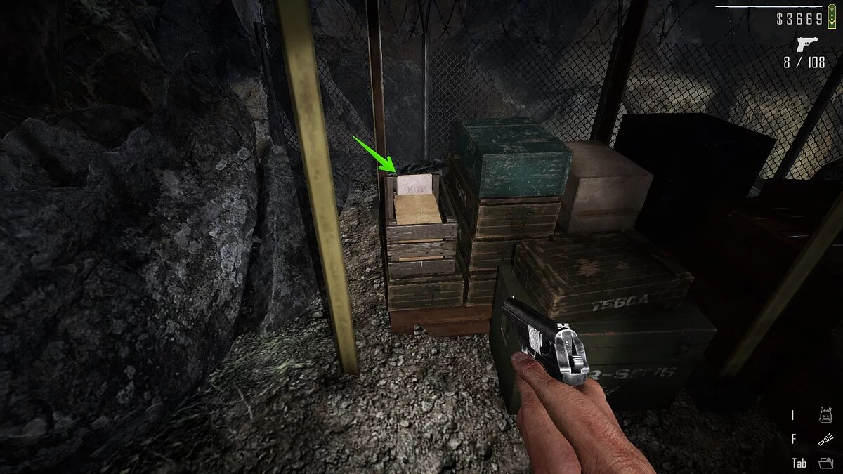 Добравшись сюда, обойдите здание и найдите калитку, при помощи которой можно оказаться на заднем дворе. Слева от верстака рядом с генератором лежат ящики зелёного цвета. На одном из них находится папка с документами.