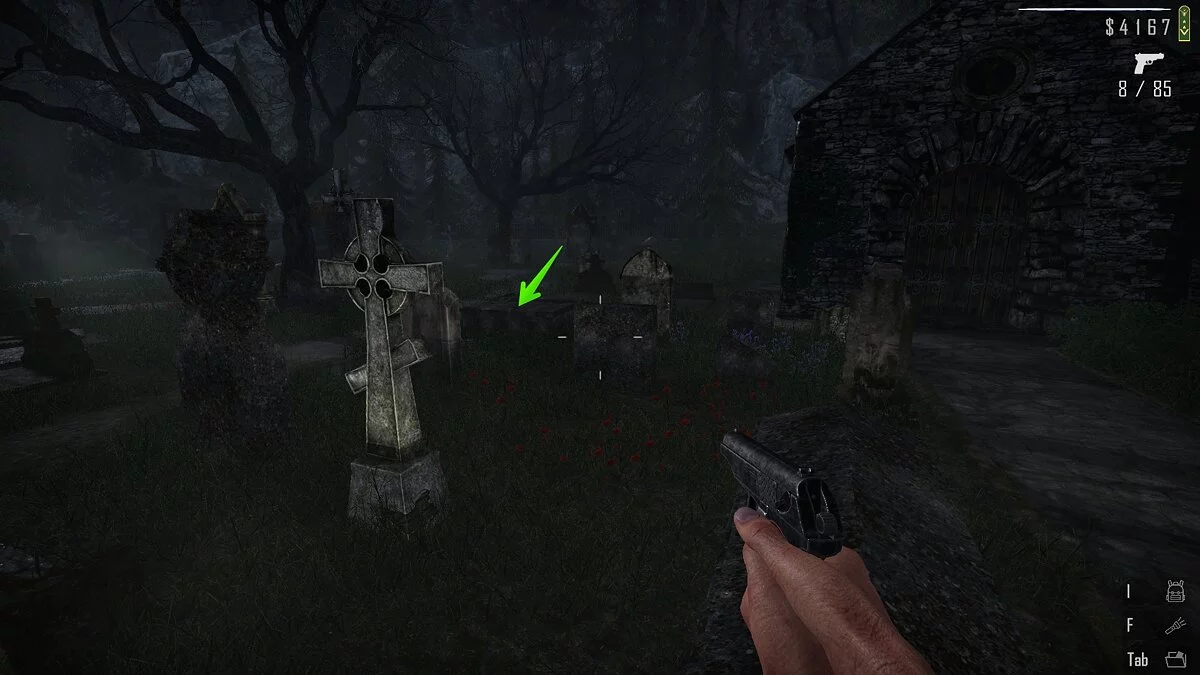 Войдите на территорию кладбища и пройдите вперёд до часовни. Слева есть несколько могил, а в одной из них будет большая трещина. Внутри виднеется папка с документами.