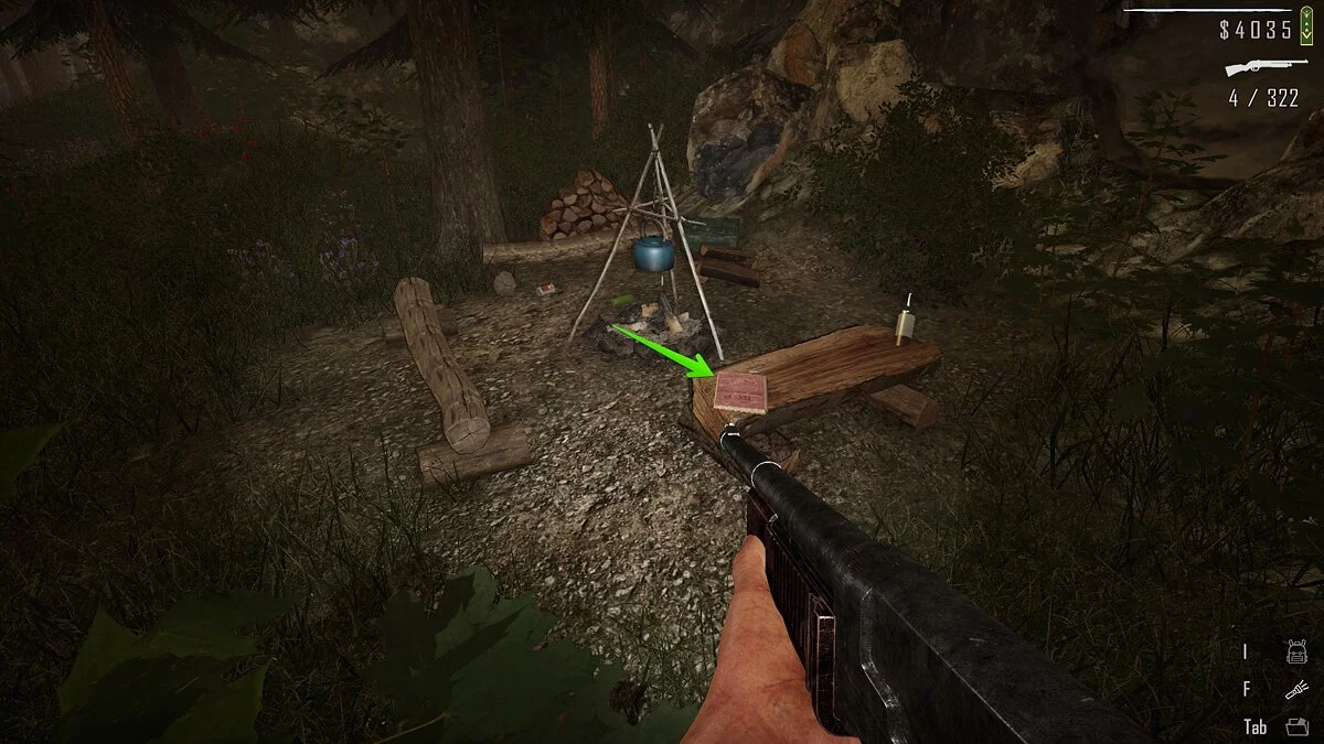 Неподалёку от оружейного магазина есть проселочная дорога, на которой можно найти импровизированный лагерь туристов. На скамье лежит папка с документами.