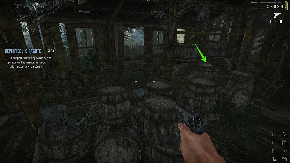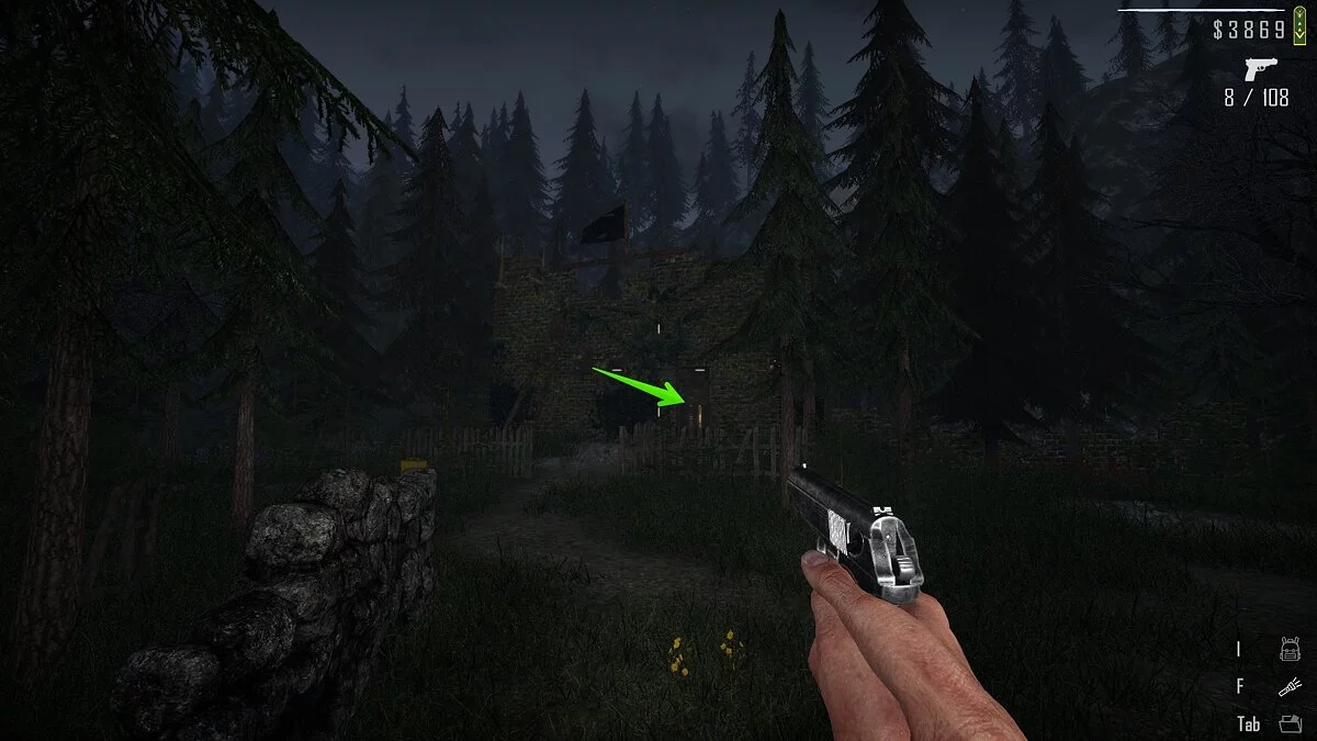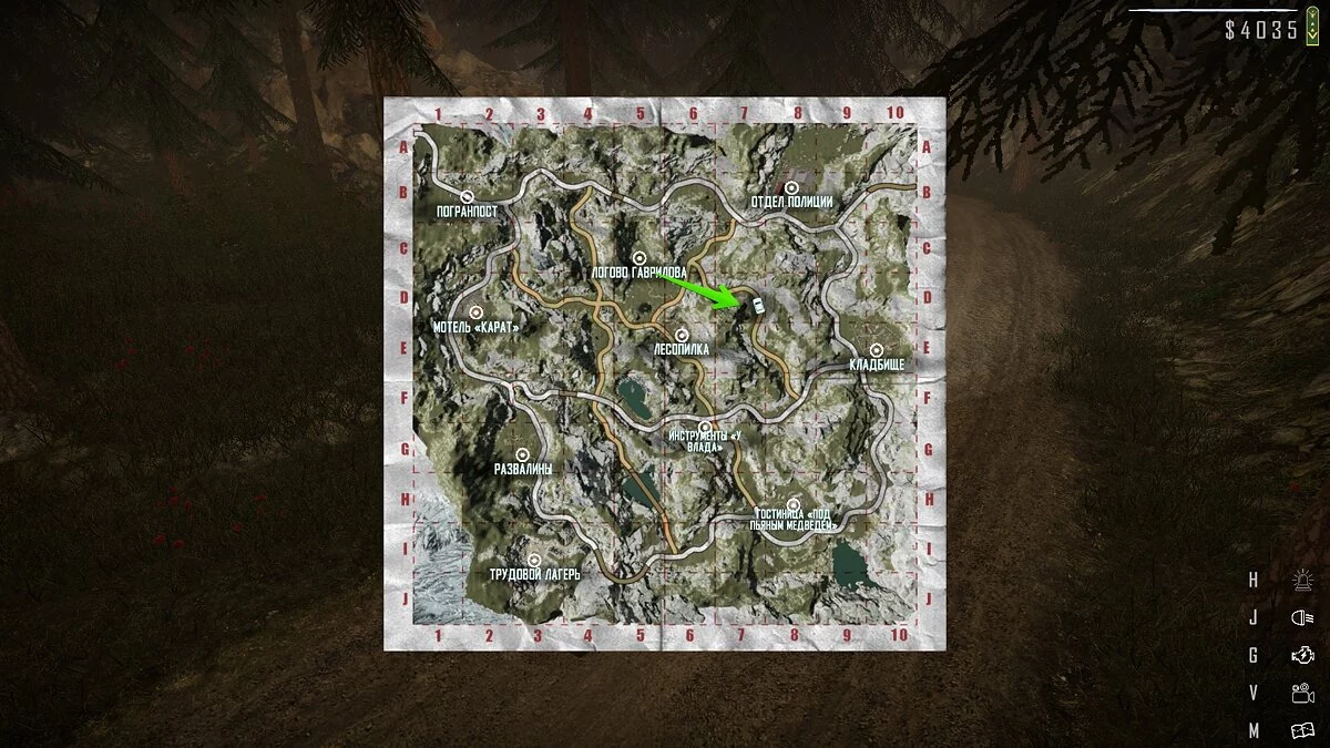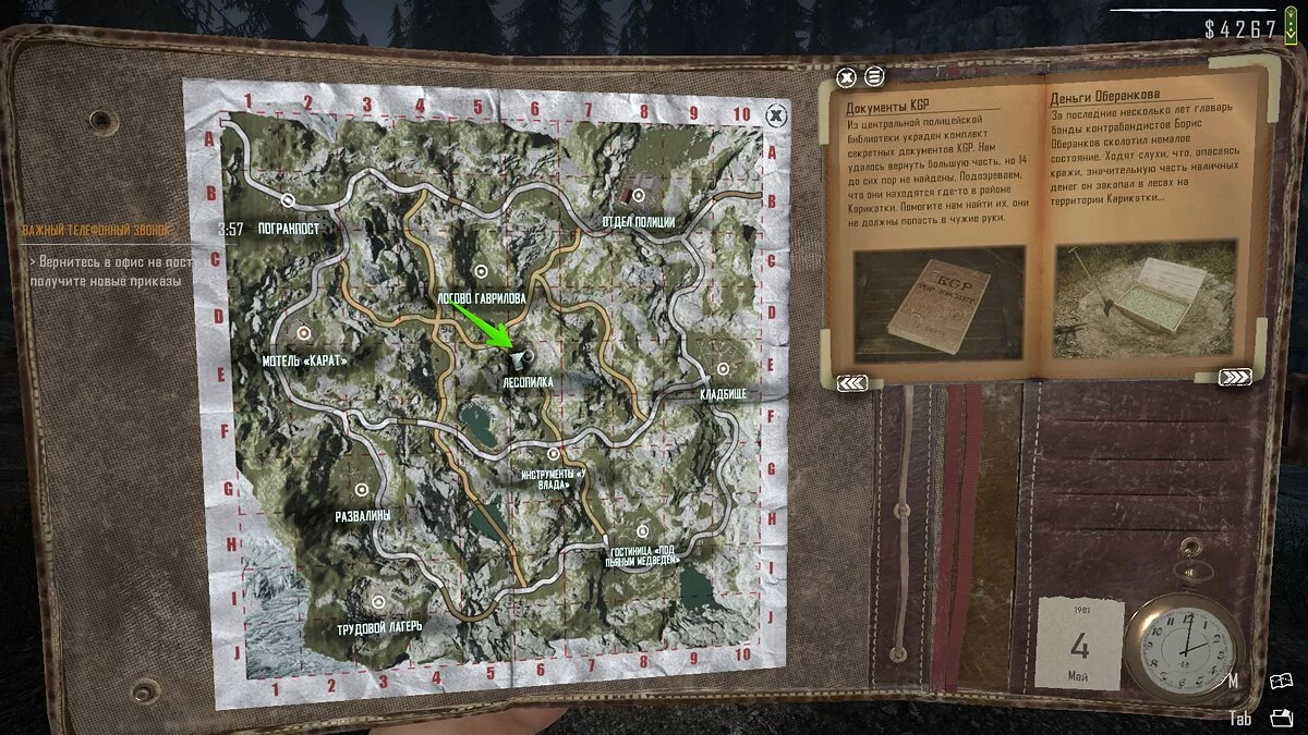В лесу между лесопилкой и мотелем «Карат» есть проселочная дорога. По пути вы увидите здесь разрушенный одноэтажный дом. Зайдите внутрь и заберите документы.