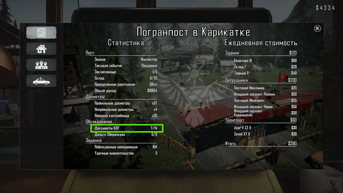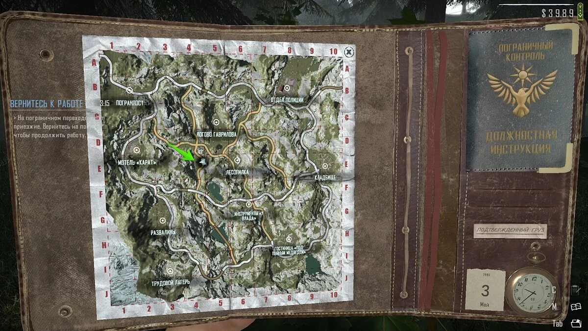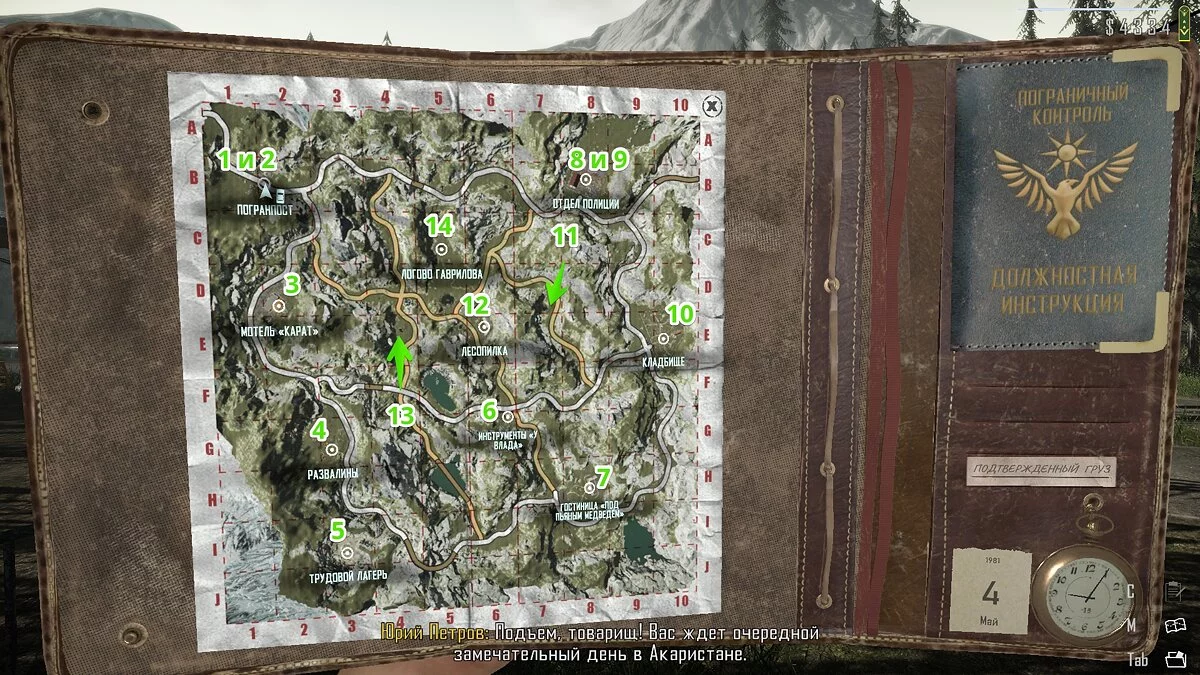 Неподалёку от погранпоста есть мотель «Карат». Вы будете проезжать мимо него каждый раз, двигаясь к трудовому лагерю. По пути можете забрать документы. Справа от здания стоит большой грузовик, в кузове которого есть папка с документами.