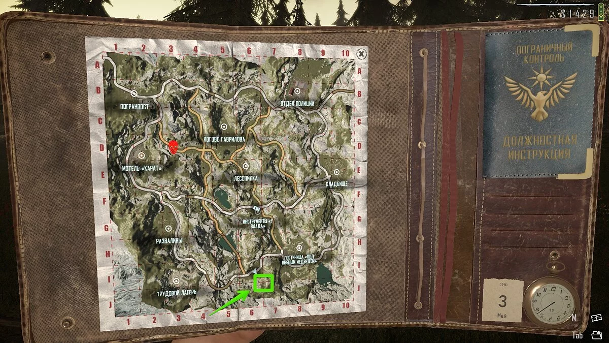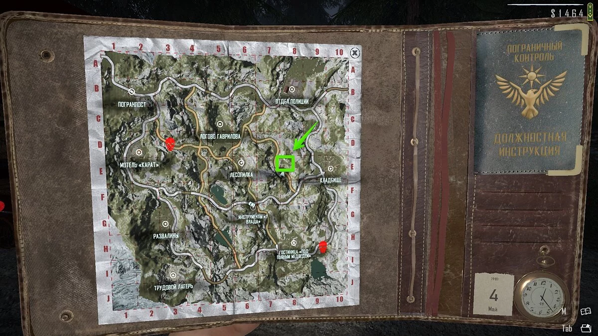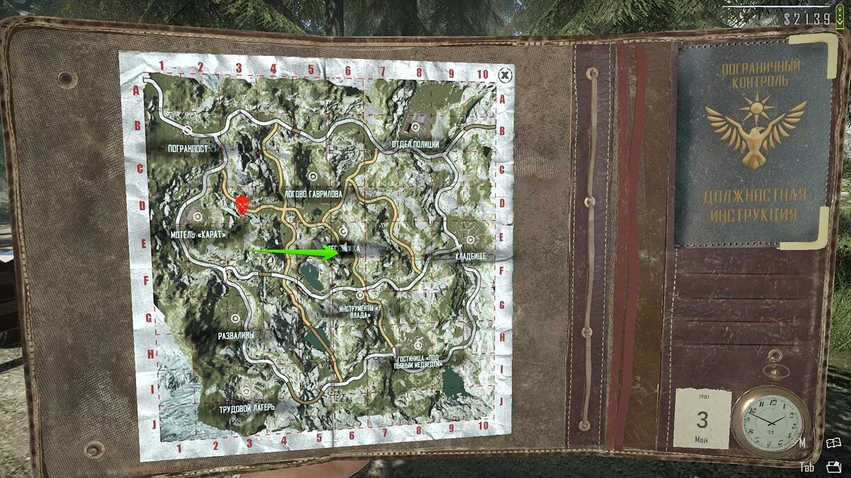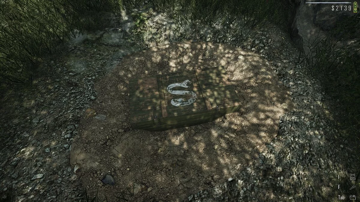 Теперь следует посетить местность рядом с логовом Гаврилова (метка на карте появится после прохождения сюжетного квеста). Если вы находитесь на перекрестке двух проселочных дорог, то следуйте вдоль скалы к пруду. Не доходя до него в лесу вы должны найти тайник. Если же вы идёте от дома Гаврилова, то держитесь правой стороны.