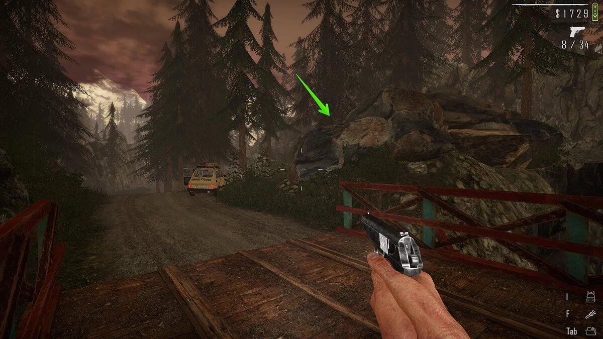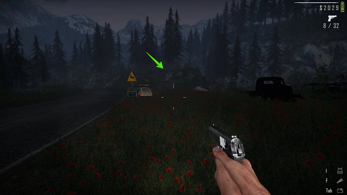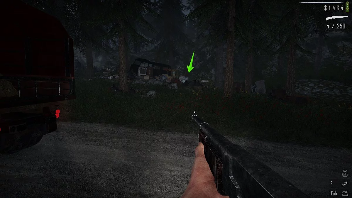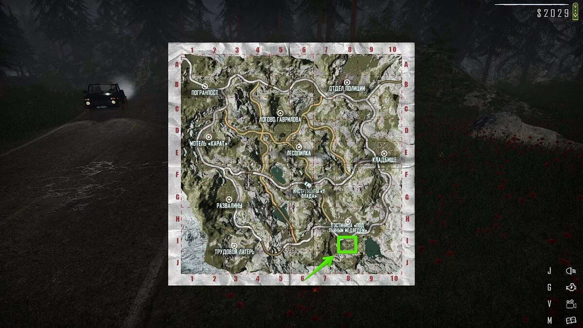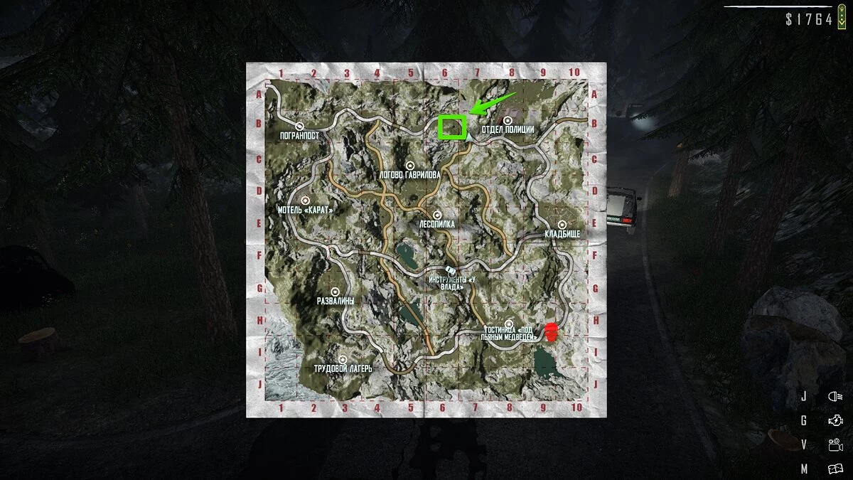Вернитесь на южную трассу и следуйте до гостиницы «Под пьяным медведем». На перекрёстке сверните направо и остановитесь у первого холма (здесь в траве есть несколько сгоревших автомобилей). Поднимитесь на сам холм и найдите тайник.