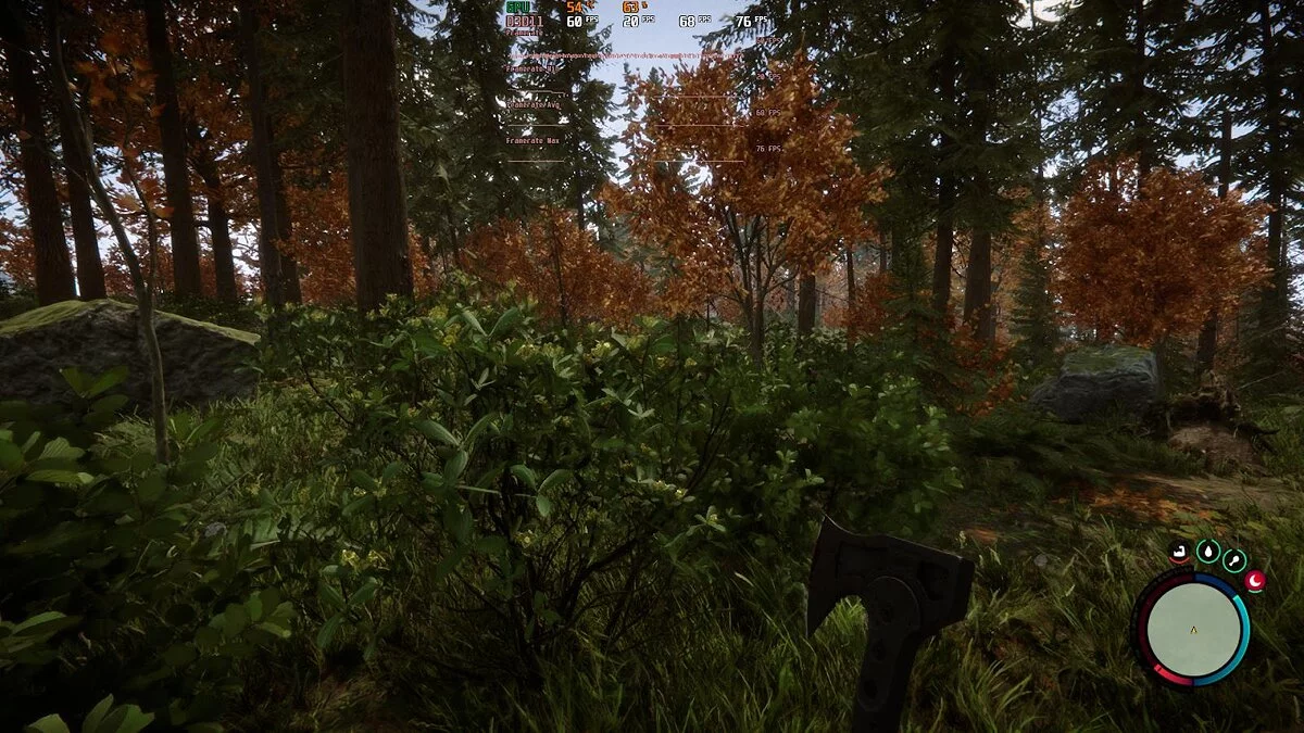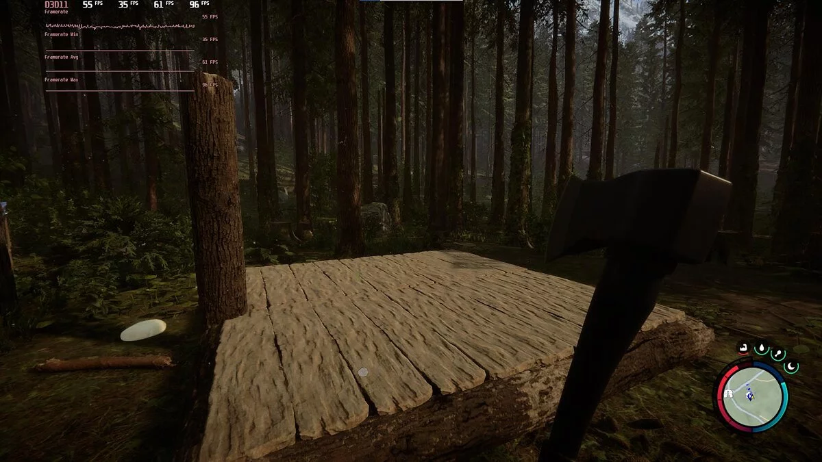 Несмотря на более тонкие настройки, в сравнении с другими играми Sons of the Forest не выдавала стабильные кадры. Максимальное значение остановилось на уровне 96 FPS, минимальное значение было замечено на 35 FPS. В среднем игра выдавала 61 кадр в секунду, если особо ничего не трогать.