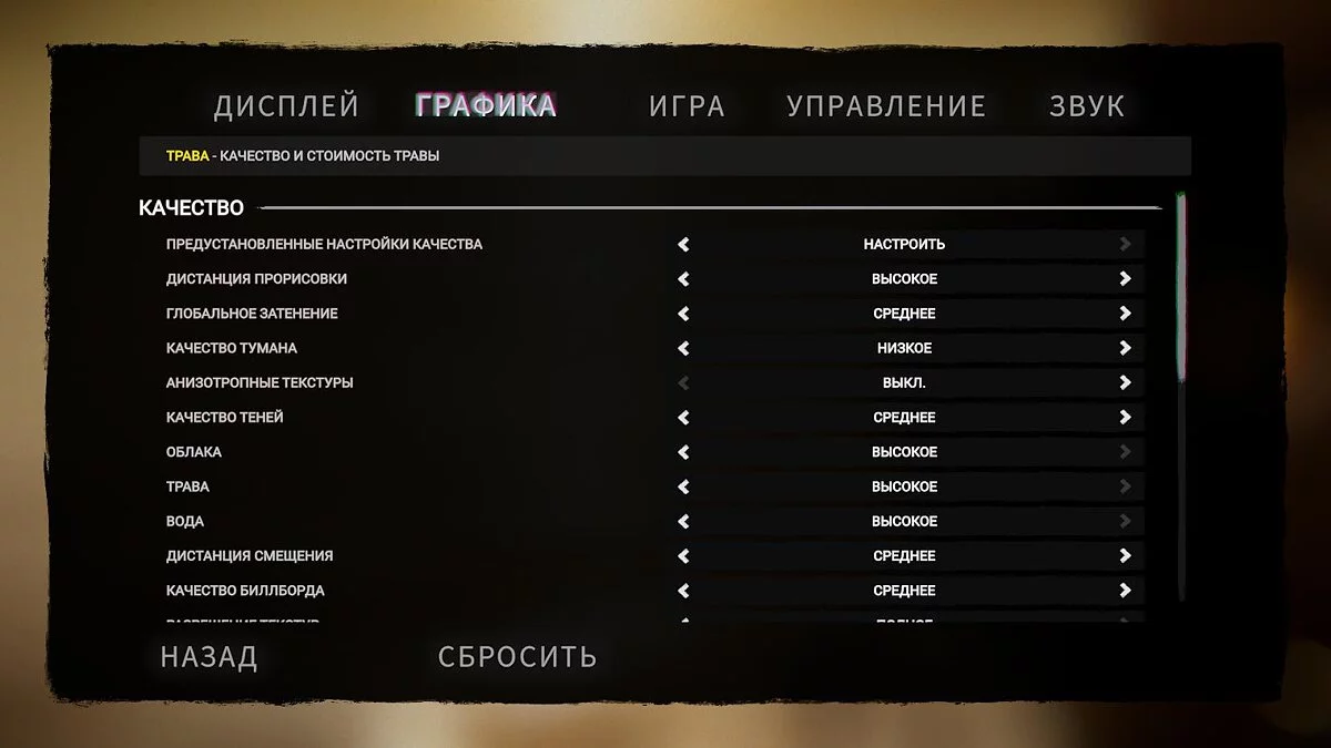 Выбраны базовые предустановки: в основном все параметры установлены на варианте «Низкие». Остальное оставили без изменений.