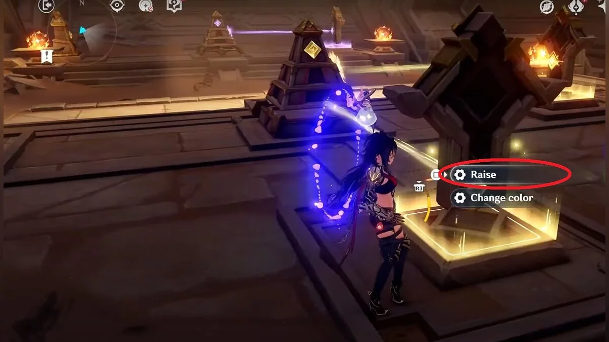 Пройти дальше не получится — дверь закрылась. Чтобы открыть её, вам нужно решить головоломку с кристаллами. Подойдите к правому монументу и выберите вариант «Выше». После этого останется сменить его цвет.