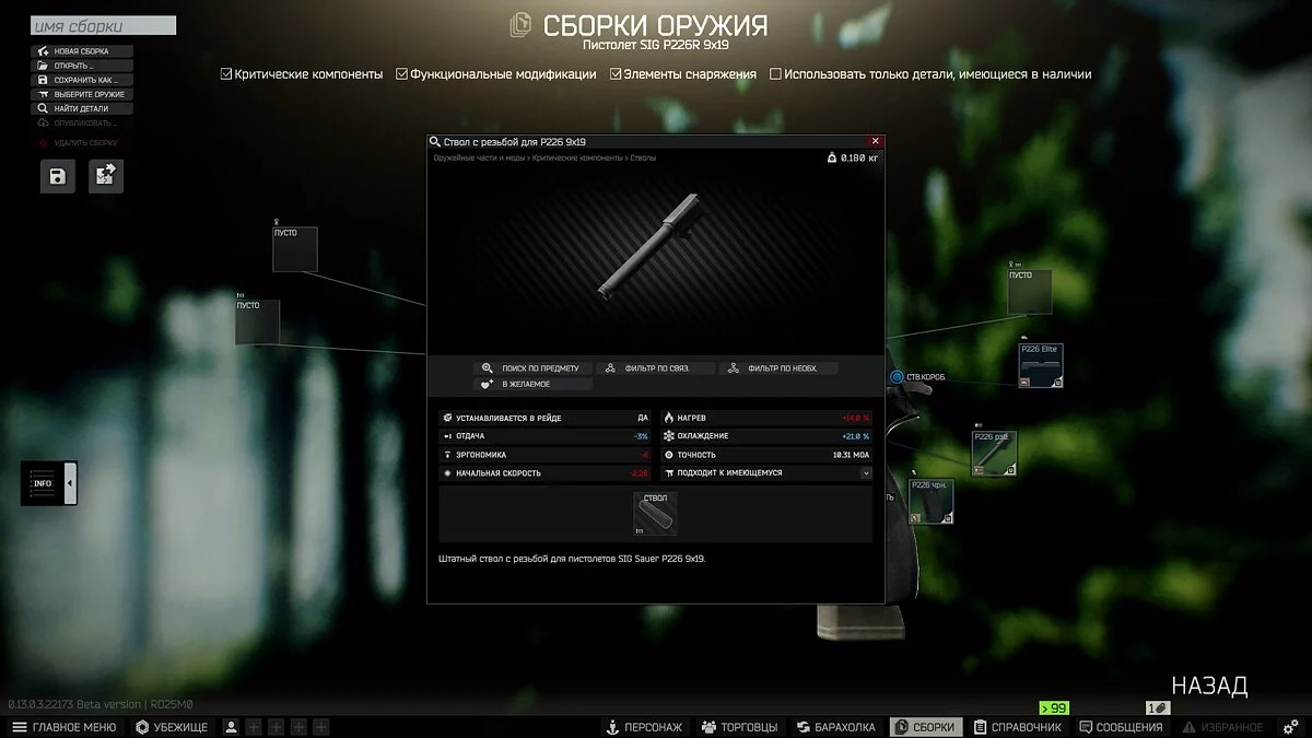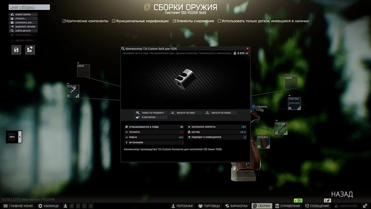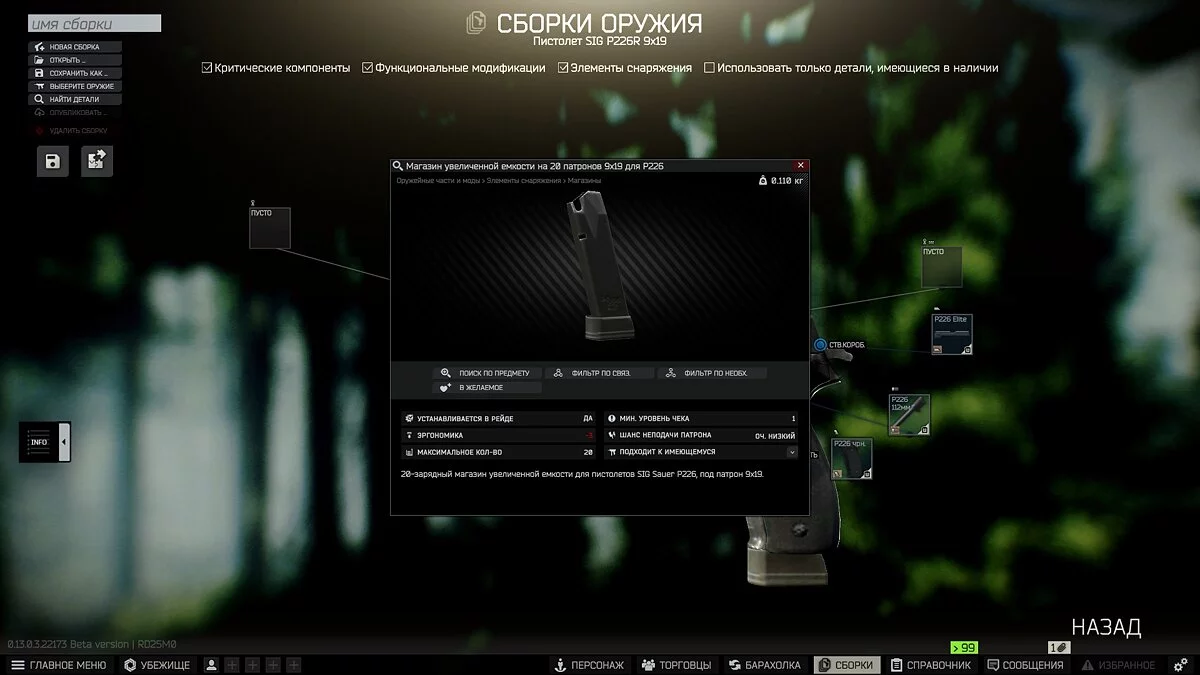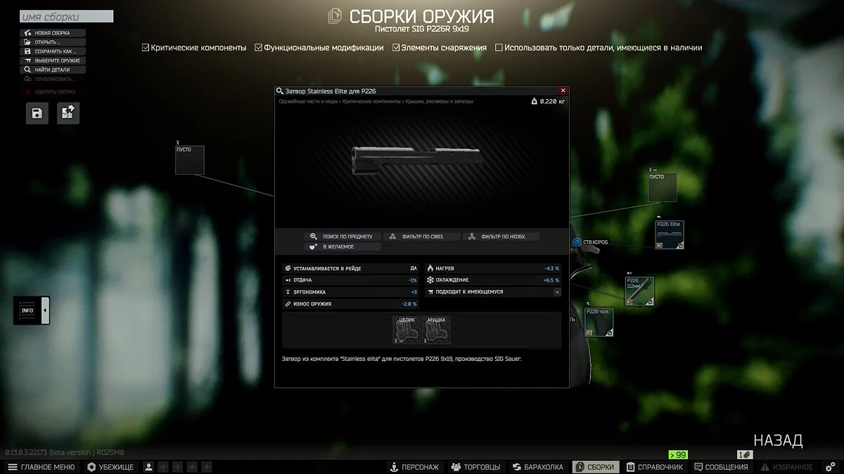 На очереди сборка пистолета SIG P226R 9x19. Для выполнения данного квеста ЧВК обязательно должен достигнуть 19 уровня. Вам понадобятся модули: