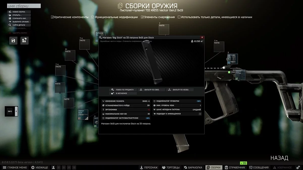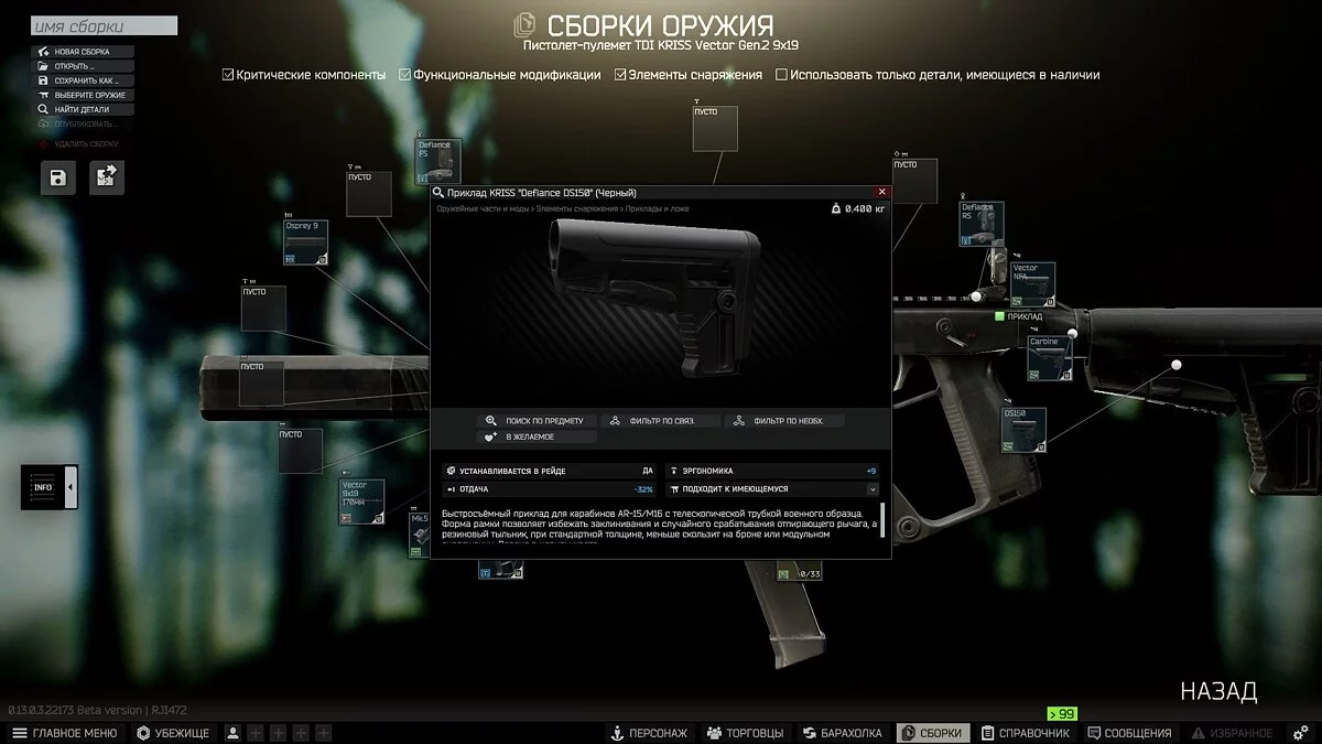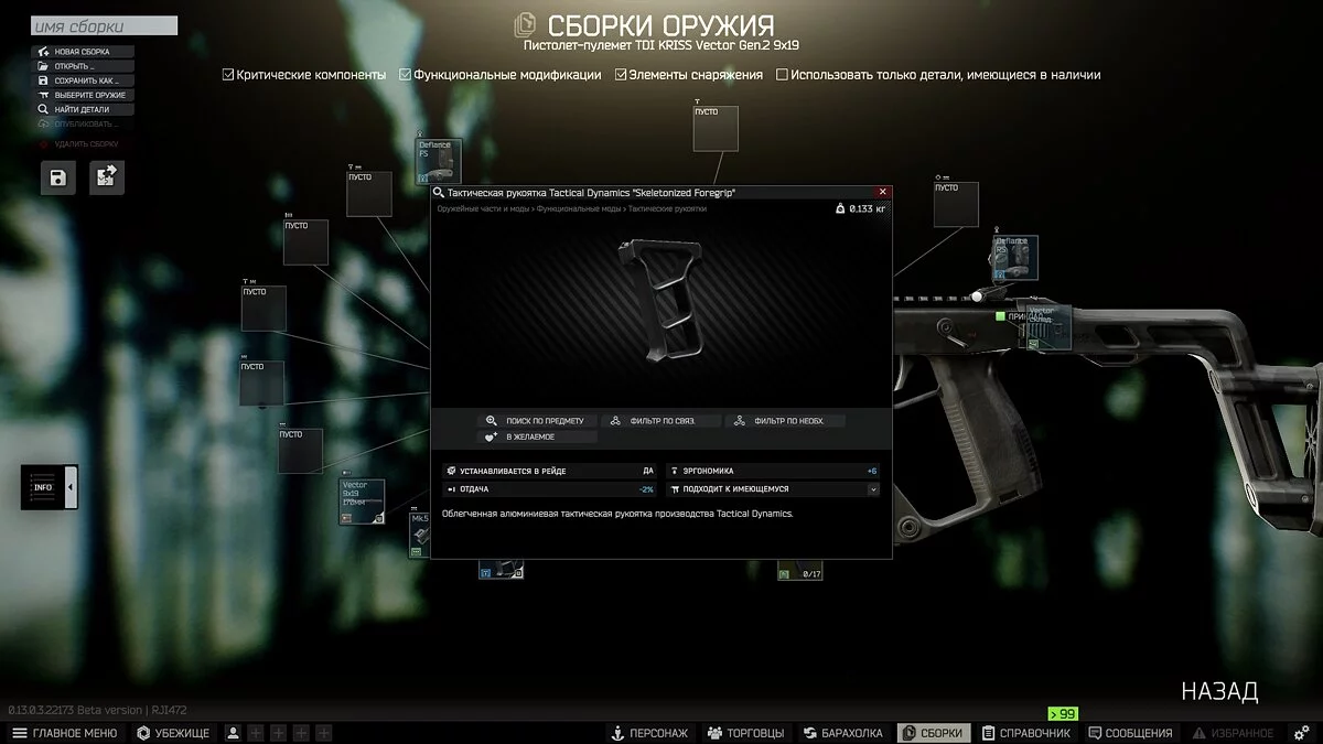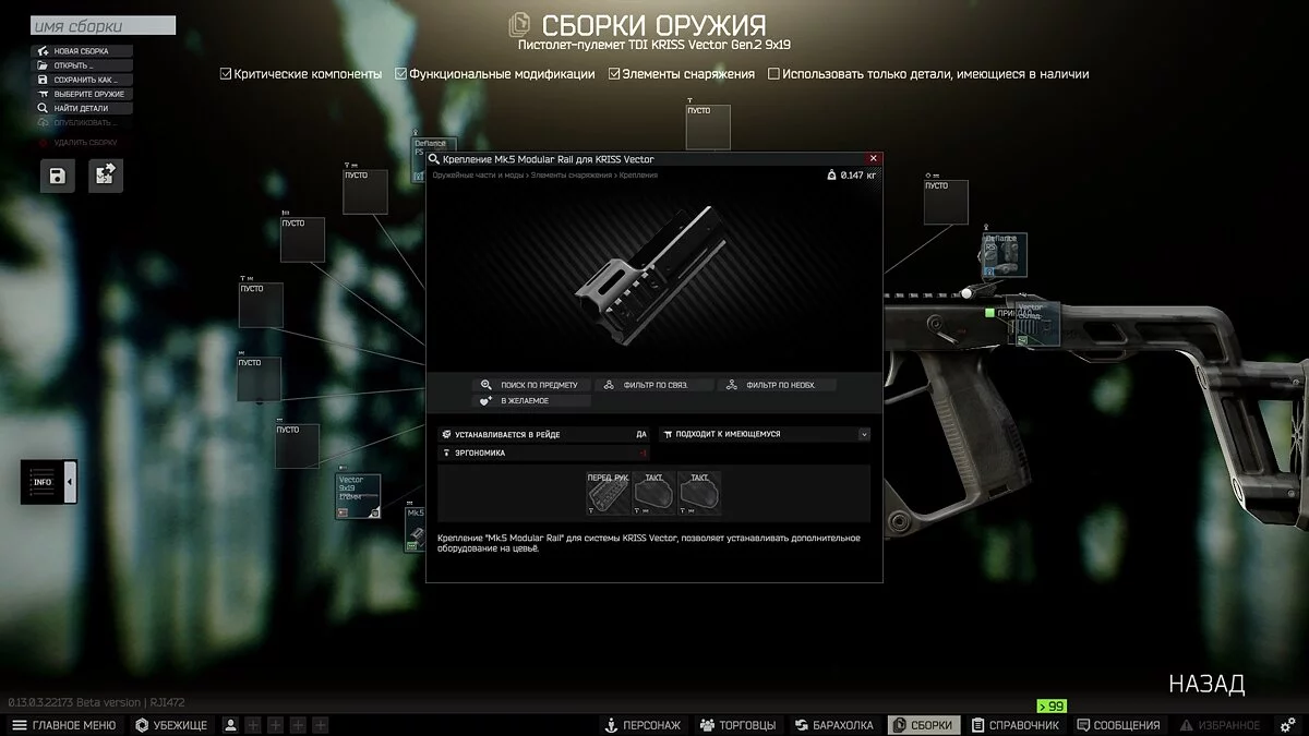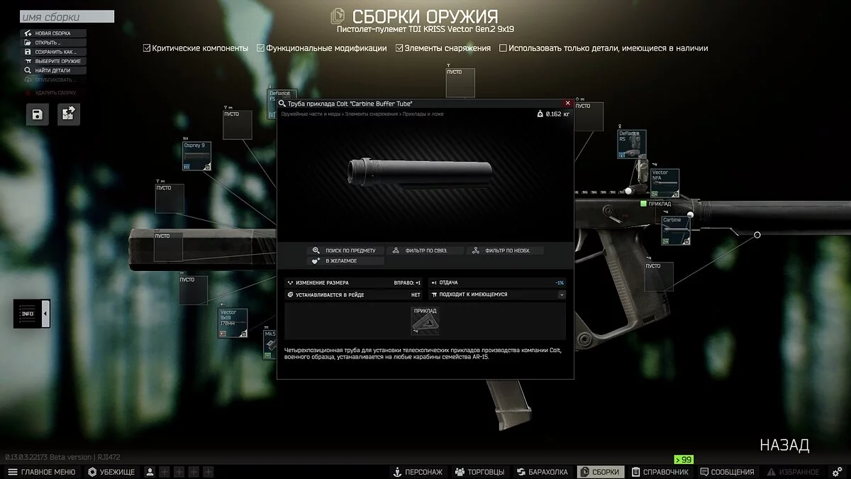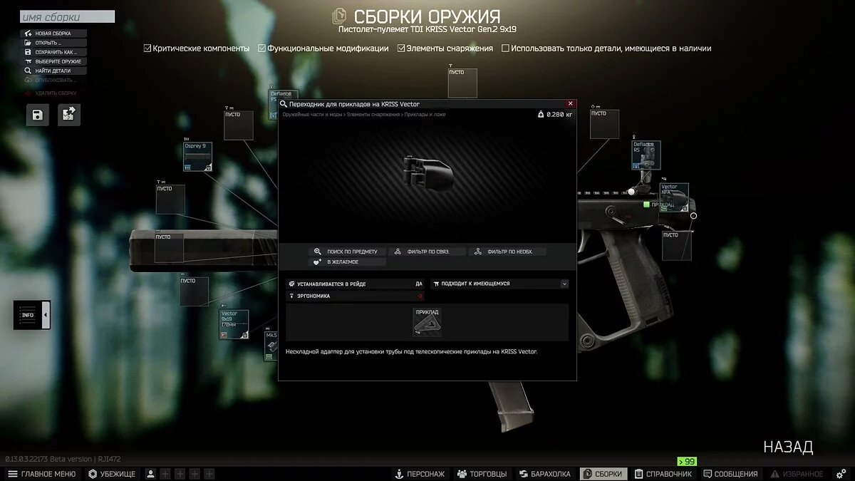 Квест открывается при достижении 22 уровня ЧВК. Вам нужно собрать KRISS Vector 9x19. Купить его можно на 3 уровне Лыжника за 96 тыс. руб, приобрести на барахолке или вынести из рейда. Сборка следующая:
