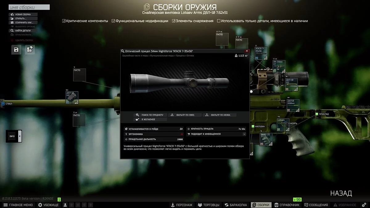 - Оптический прицел Nightforce ATACR 7-35x56 — Егерь (4) или бартер у Егеря (2) на 1 Повербанк, 2 Магнита и 1 Ультрафиолетовую лампу.